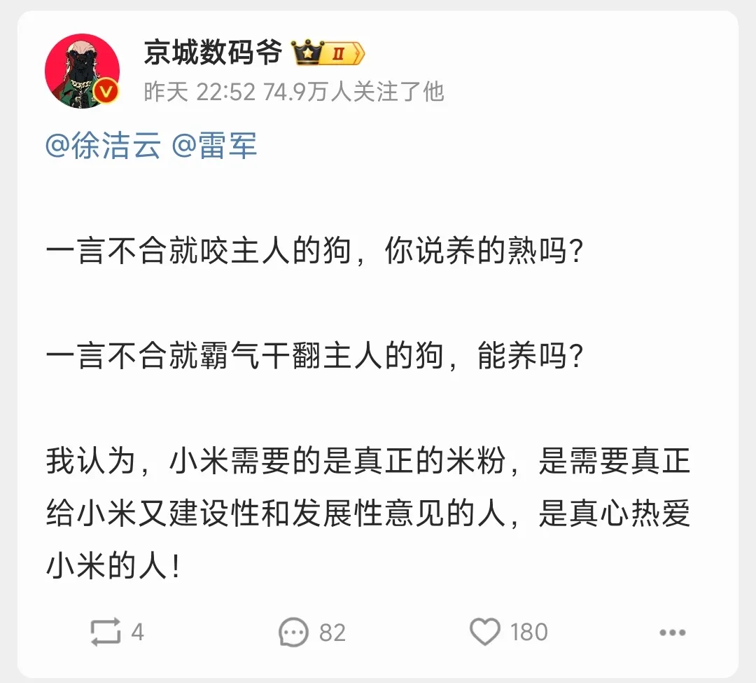 从其过往言论看,明显属于花系大V,和米粉的很多互呛互骂,不可调和!