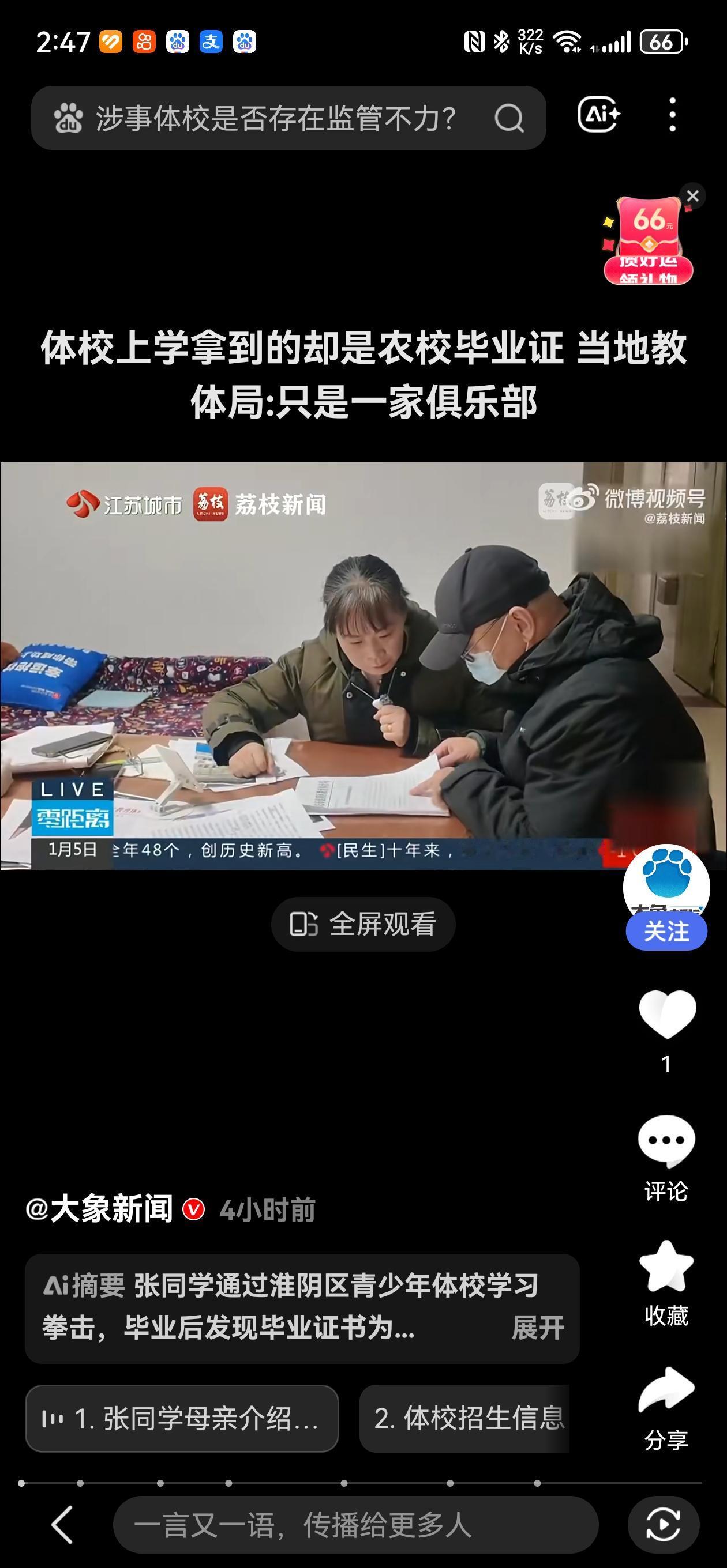江苏淮阴区余女士因儿子初中成绩不理想,将其送至自称"淮阴区青少年体校"的机构学习拳击,‌封闭训练3年半后‌获得的毕业证显示为江苏省农业广播电视学校颁发的非全日制家庭农场生产经营专业证书。当地教体局核实该机构实为无办学资质的搏击俱乐部,已运营十余年。‌‌ 这则事件揭示了教育和培训市场中的一些乱象,也反映出部分家长在孩子教育问题上的盲目信任和风险意识不足。江苏淮阴区的余女士为了改善儿子的学习成绩,将其送到一所自称“淮阴区青少年体校”的机构进行拳击训练。然而,经过三年半的封闭训练后,孩子获得的“毕业证”竟然是由江苏省农业广播电视学校颁发的非全日制家庭农场生产经营专业证书,这明显与其接受的体育训练内容不符。 当地教体局核实后确认,该机构实际上是一家无办学资质的搏击俱乐部,已运营十余年,未获得合法的教育资质。这一事件暴露出一些非法培训机构利用家长对孩子教育的焦虑,打着“青少年体育培训”的幌子进行非法运营,甚至发放虚假证书,严重损害了学生权益和教育公平。 此事提醒家长在选择培训机构时应格外谨慎: 核实资质:确认培训机构是否具备合法的办学许可证和相关资质。 了解课程内容:确保所提供的课程和证书与实际培训内容相符。 警惕虚假宣传:不要轻信夸大宣传或虚假证书,避免上当受骗。 咨询官方部门:遇到疑问时及时向教育主管部门咨询核实。 对于相关监管部门,应加强对非法培训机构的监管力度,严厉打击无资质办学行为,保护学生的合法权益。同时,也希望家长们理性选择教育培训机构,关注孩子的成长和教育质量,避免盲目追求短期“捷径”。
