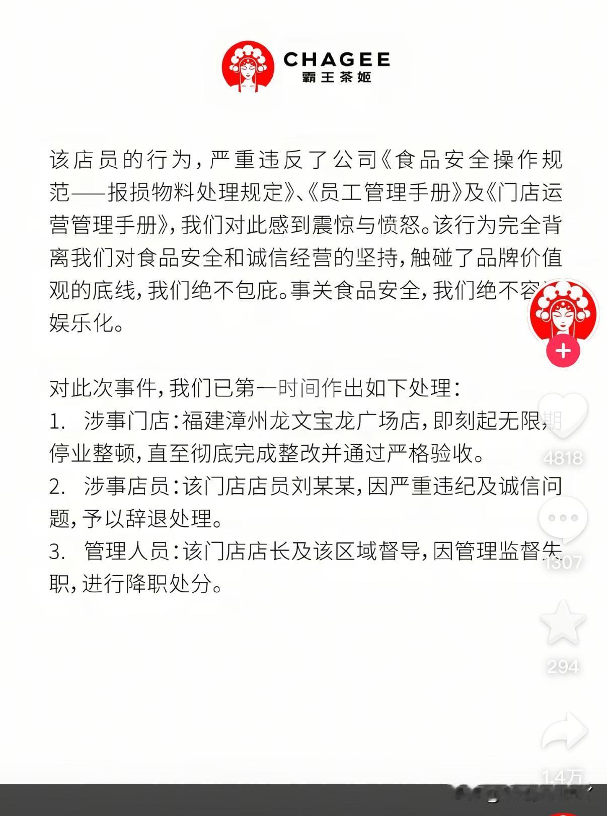 2026刚开年霸王茶姬运营部天都塌了! 论年轻人能在工作中闯多大的祸,霸王茶姬小妹告诉你,1月6号一则女生在店里放着印度歌曲、穿着印有奶茶店logo的品牌服饰徒手搅拌奶茶的视频让一众网友看傻了眼 这小姑娘拍视频的时候笑的有多开心现在哭的就有多大声,我相信她是用处理报废物料拍的视频,那杯奶茶也没有给任何人喝就是想跟风发个段子但关键是你穿着工服…这恐怕会带来牢狱之灾而且还要背负巨额债务 对此霸王茶姬也是紧急发布调查处理报告,涉事门店无限期停业整顿、女孩被辞退、该区的督导和门店店长被降级 单单一个门店无限期停业整顿这家门店的老板就不一定能放过她