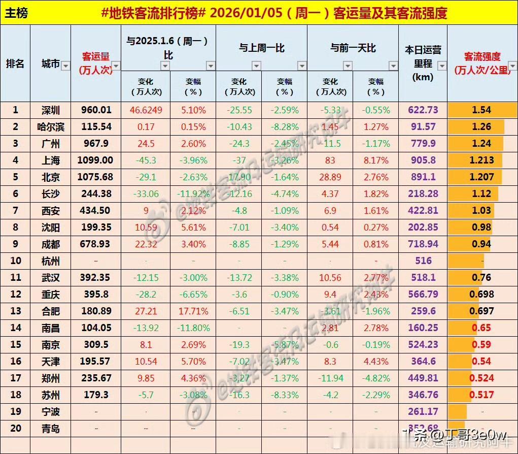 重庆地铁客流量周一达395万人次,重新超过了武汉[呲牙][呲牙][呲牙] 爆料 身边事 中国地铁客流日报 昨日客流 周一 排行榜 重庆地铁 武汉地铁 2026年1月5日 星期① 全国重点城市轨道交通客流量排行榜: 上海:1099.00万 北京:1075.68万 广州:967.90万广州地铁 深圳:960.01万深圳地铁 成都:678.93万 西安:434.50万西安爆料 杭州:390万+杭州地铁 重庆:395.80万重庆身边事 武汉:392.35万武汉爆料 南京:309.50万 长沙:244.38万长沙地铁 郑州:235.67万郑州地铁 沈阳:199.35万 天津:195.57万天津身边事 合肥:180.89万合肥爆料 苏州:179.30万苏州地铁 青岛:115万+ 哈尔滨115.54万哈尔滨身边事 宁波:100万+宁波爆料 南昌:104.05万