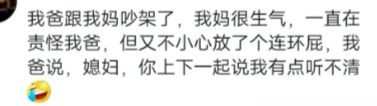 我爸跟我妈吵架了,我妈很生气,一直在责怪我爸,但又不小心放了个连环屁,我爸说,媳妇,你上下一起说我有点听不清