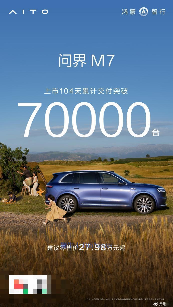 今日,据博主”我鸿“分享,全新问界M7上市104天,交付量突破70000台。