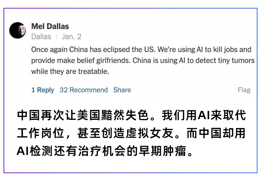 报道引起美国网友热议,仅在该报的网站,就有数百条评论。一条被点赞过百的评论说:“中国走上了一条不同的AI之路:解决实际问题。”另一条高赞评论说:“中国再次让美国黯然失色。我们用AI来取代工作岗位,甚至创造虚拟女友。而中国却用AI检测还有治疗机会的早期肿瘤。”