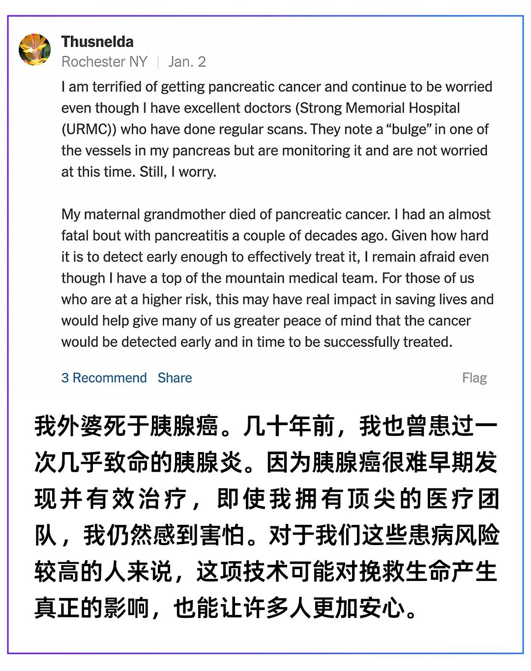 而一些被胰腺癌夺走亲朋好友的美国民众,则真情实感地期盼能用上这项中国AI,并鼓励中国AI研究人员:“这项研究能让许多人安心”“请坚持这项研究”。