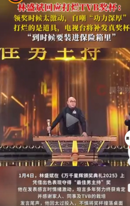 在TVB的颁奖典礼上的一个小插曲,可以说瞬间逗笑了现场所有的人。林盛斌发表获奖感言时激动的说出那句多谢时。没想到奖杯却一分为二了。