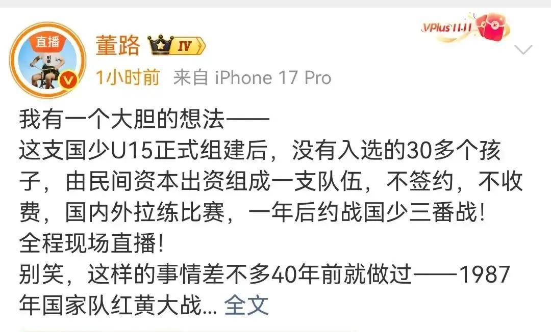 董路这次彻底急眼了,甚至可以说是在“赌命” 国少队那一纸50人的大名单,就像一记响亮的耳光,直接扇在了这群练了七八年球的孩子脸上。周海滨要搞地面传控,那是“正规军”的高级玩法,董路的这帮孩子入不了法眼,被贴上了“只会开大脚”的标签 既然你们看不上,那就自己干。董路自掏腰包把这30个“弃婴”捡回来,放话一年后要跟国少队踢三番战。这哪是踢球这是在踢中国足球那块早就不要了的遮羞布 我在媒体圈混了这么多年,见过太多所谓的“选材标准”。往往是看着顺眼的留下了,有特点的反而被当作异类剔除。这就好比我们就喜欢那种听话的、会做PPT的员工,而那些真正能在大街上把货卖出去的野路子,永远进不了大厂的门 一边是温室里精心修剪的盆景,一边是野地里顶风冒雪的野草。官方讲究的是战术素养,是所谓的“先进理念”,民间要的是生存,是把球踢进网窝的原始本能 这场约战,我反而希望董路能赢。不为别的,就为了证明有时候“野路子”未必就干不过“学院派” 如果一年后这帮“弃子”真把国少队给赢了,那才是中国足球最大的黑色幽默