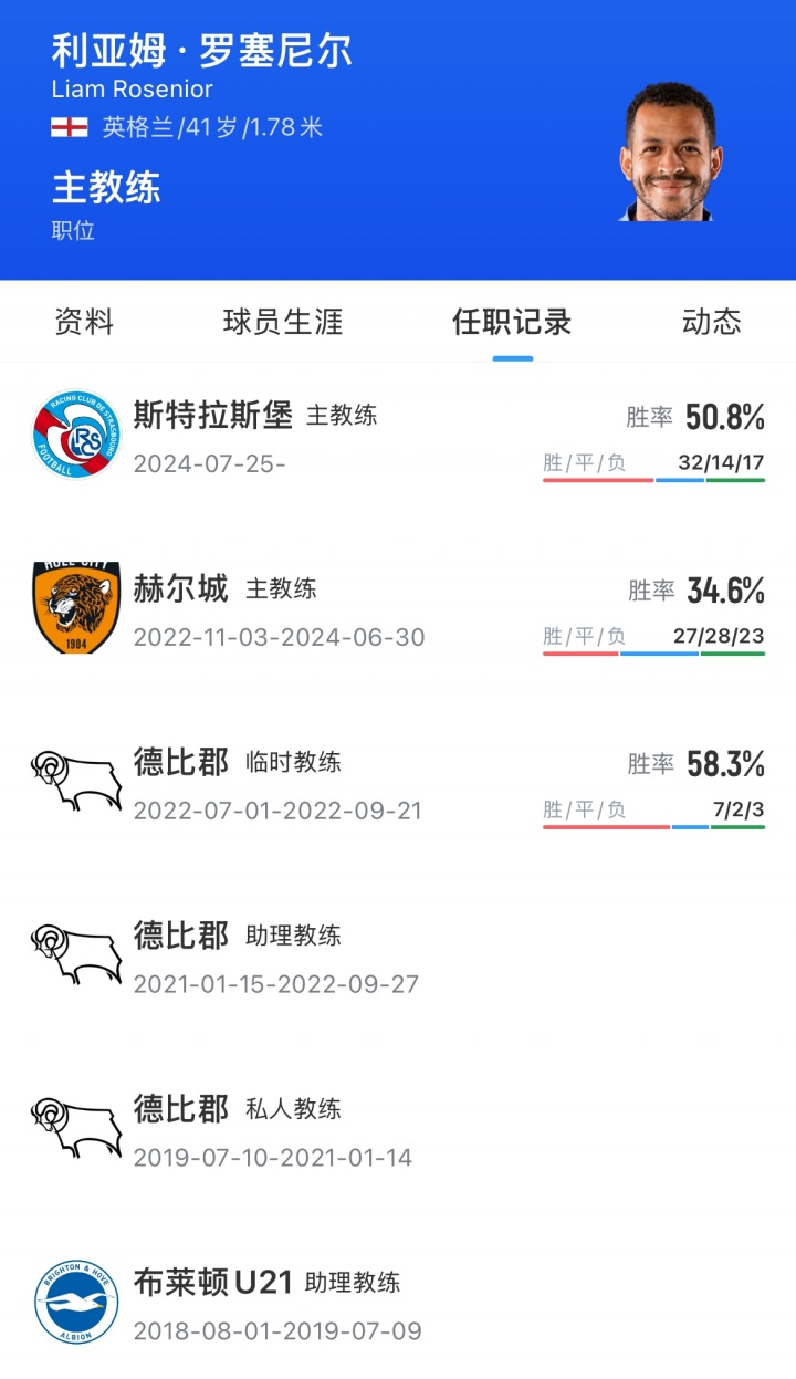 41岁的罗塞尼尔球员生涯曾效力布莱顿、赫尔城、富勒姆等球队,2024年夏天成为斯特拉斯堡主帅并执教至今。他曾是鲁尼在德比郡的助教。