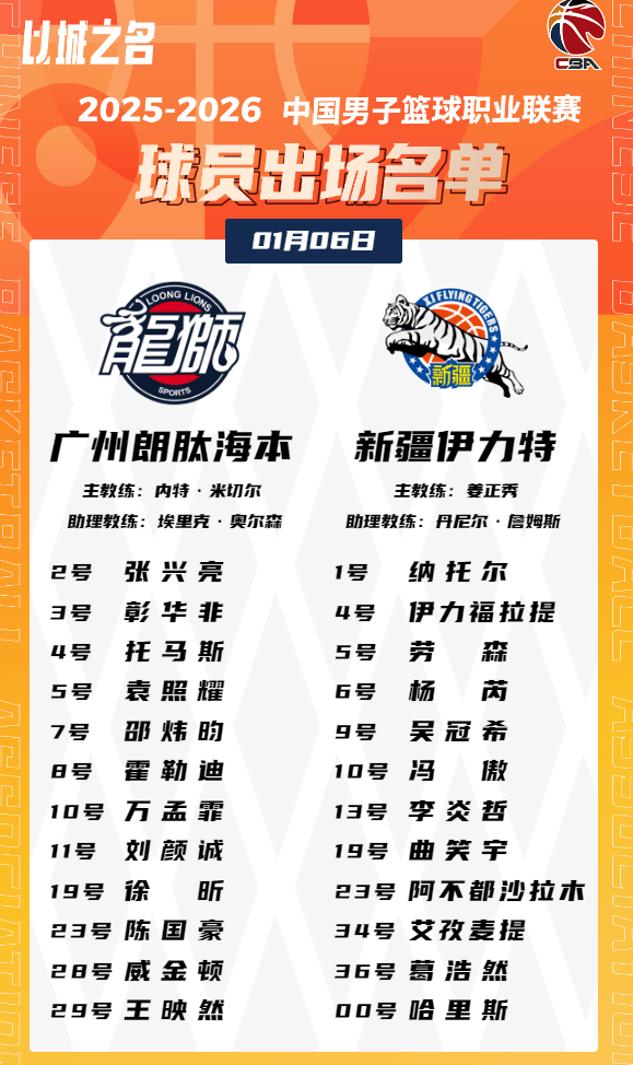 虎扑01月06日讯今晚CBA常规赛,广州对阵新疆的大名单已经公布。