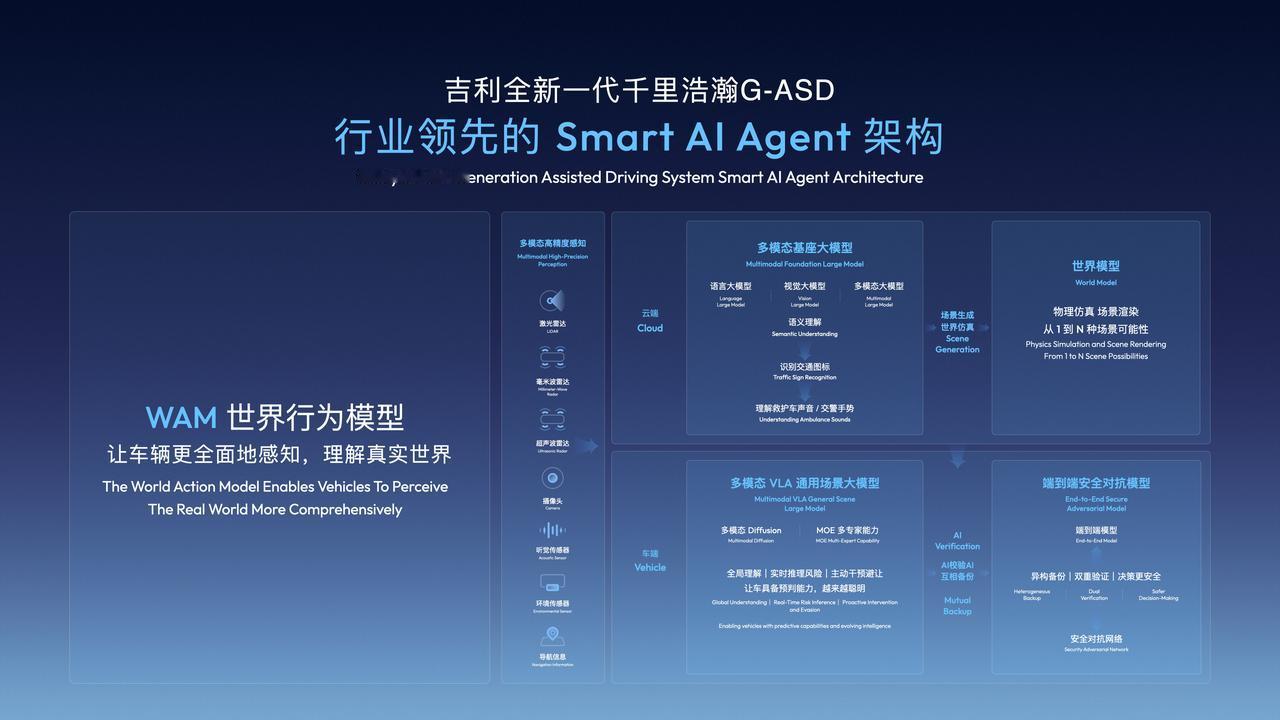 吉利全域AI 2.0与千里浩瀚G-ASD的发布,是其从“汽车制造商”向“智能科技出行企业”转型的关键一跃。全域AI 2.0以WAM世界行为模型构建统一智能中枢,实现跨域协同;G-ASD凭借顶尖算力、海量数据与普惠理念,让高阶智驾触手可及。二者深度融合,既筑牢全场景安全底线,又以技术平权重构行业生态,彰显中国车企在智能电动化赛道的引领实力。
