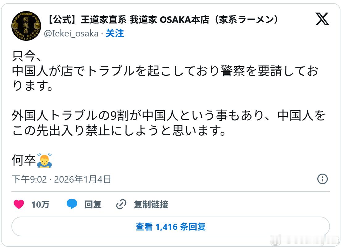 【大阪拉面店拟禁中国人入店,双重定价差1.6倍引发争议】海外新鲜事日本 近日,日本大阪一家拉面店在社交平台「X」发布公告称,由于店内外国人相关纠纷中约九成涉及中国人,店方正考虑今后禁止中国人入店。这一言论迅速在网络上引发热议,有人表示支持,但也有人指出,纠纷的根源可能是价格问题——该店对外国人和日本人实施双重定价,英文版菜单售价约为日文版的1.6倍。所谓“双重定价”,是指同一商品或服务对不同人群设置不同价格。在国外的观光景点并不罕见,例如印度的泰姬玛哈陵、埃及的吉萨金字塔、柬埔寨的吴哥窟,都存在本国人与外国人的票价差异。而此次拉面店的争议在于,看懂汉字的中国顾客发现价格与英文版不符时,可能报警维权。例如,一碗含税1130日元的拉面,英文菜单标价为1900日元,价格差距约1.6倍。对此,日本学者木曾崇指出,这一事件显示,以“外国人附加费”形式实施双重定价注定难以奏效。店家通常以“非日文使用者=外国人”来设定价格,但遇到看得懂汉字的外国人时,这一做法立刻失效。而如果直接询问顾客“是否为外国人”,则可能构成歧视;对于排队长、客流量大的店铺,还会增加服务人员的压力。木曾崇还分享了他在美国拉斯维加斯观察到的做法:旅游旺季时,一些热门餐厅会提高价格,但当地人只需出示身份证即可享受正常价格。夏威夷也有类似做法,顾客凭当地驾照或州身份证,可以在餐厅、酒店、主题公园、水族馆及博物馆等场所享受折扣。图:日本大阪1家拉面店因考虑禁止中国人入店,让该店的双重定价在社群平台上引起话题。 (图撷取自