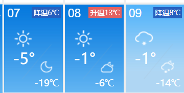 [未来一周]气温起伏很大,而且预计有一场降雪。周四进入三九,早晨达到本次降温过程最低,东部及北部地区最低气温为-20℃~-16℃,山区局部可低至-25℃~-21℃,南部地区为-10℃~-6℃,其他地区为-15℃~-11℃。不过周四白天冷空气撤离,气温反弹。预计周五会有一场雪,沈阳、抚顺、本溪、丹东、阜新、辽阳、铁岭、朝阳地区和沈抚示范区有小雪,其他地区多云天气。随后从周六开始,辽宁将开启三九严寒模式,预计到下周二,全省气温持续下滑,最高气温仅在-10度上下。