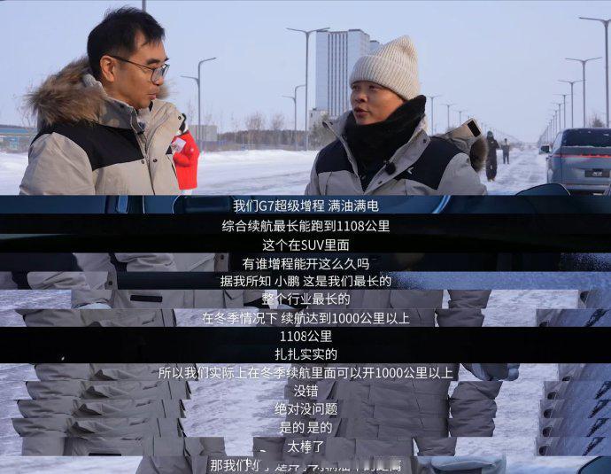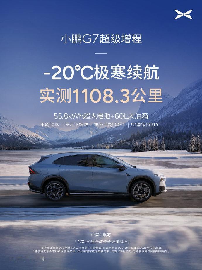 再度杀入增程式电动市场,小鹏又玩了个大活儿! 在这几天的黑河冬季实测中,小鹏G7超级增程在室外平均-20°的极端低温环境下,综合续航里程达到1108.3公里。 强调一下,这里的“实测”,指的是车辆全程不跨温区、不走下坡路、空调保持在21°C,这样还能跑1000多公里,看来小鹏汽车在进入增程式电动汽车市场之前,是做足了准备的。 做过那么多的续航实测,我必须得说,这条件非常苛刻! 小鹏推出增程式电动车型,主要原因在于,现阶段纯电车型的续航里程虽然一直都在提升,但终归存在续航焦虑的问题,增程式电动可以让用户更放心。 不过中国南北温差很大,北方冬季气温低,新能源汽车普遍存在续航缩水的问题。小鹏G7超级增程也不例外,它的官方综合续航里程是1704km,纯电续航430km,与实测的1108.3公里是存在差距的。 但重点是,黑河那种零下20°C的用车环境,绝大多数用户、绝大多数时间里,都不会遇到。在黑河都能轻松跑1100km以上,那么在正常情况下,就完全不用担心续航的问题了。 这与它的核心技术储备有关,小鹏G7超级增程的油电转换效率达到了3.6kWh/L,同时还对能量回收系统、低压耗电等进行了优化,因此才能实现行业领先。 小鹏汽车2025年销量达到了429445辆,同比增长126%,超额完成38万辆的年度目标。 这个成绩,全部由纯电车型创造。 在小鹏的潜在客户中,有一部分的确是因为纯电车型续航不足的问题而放弃了小鹏汽车,那么在小鹏G7超级增程上市之后,可以有效减轻这波群体尤其是北方用户的用车焦虑。 目前消费者对增程式电动的认可度越来越高,小鹏G7超级增程又用这次实测证明了自己。 重开一条产品线的小鹏,2026年有望更上一层楼!何小鹏零下20度冬测P7+和G7
