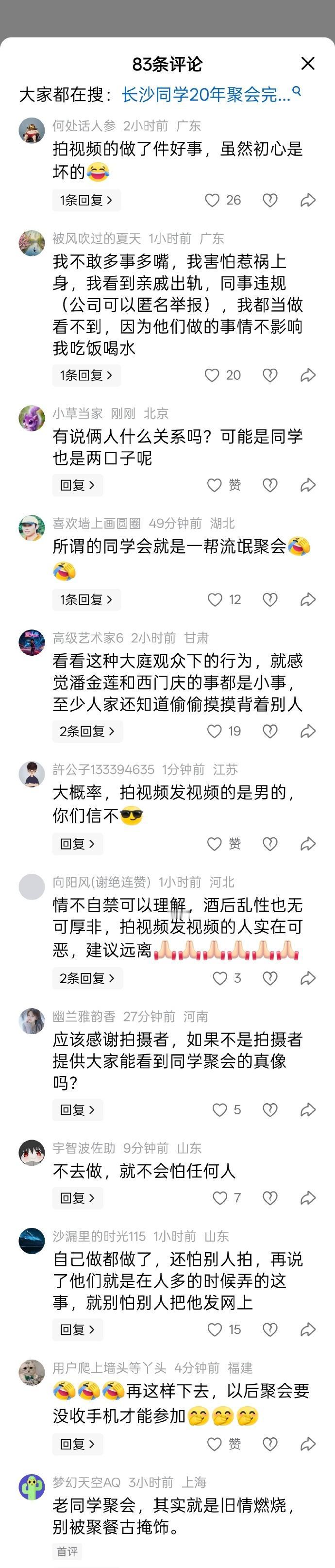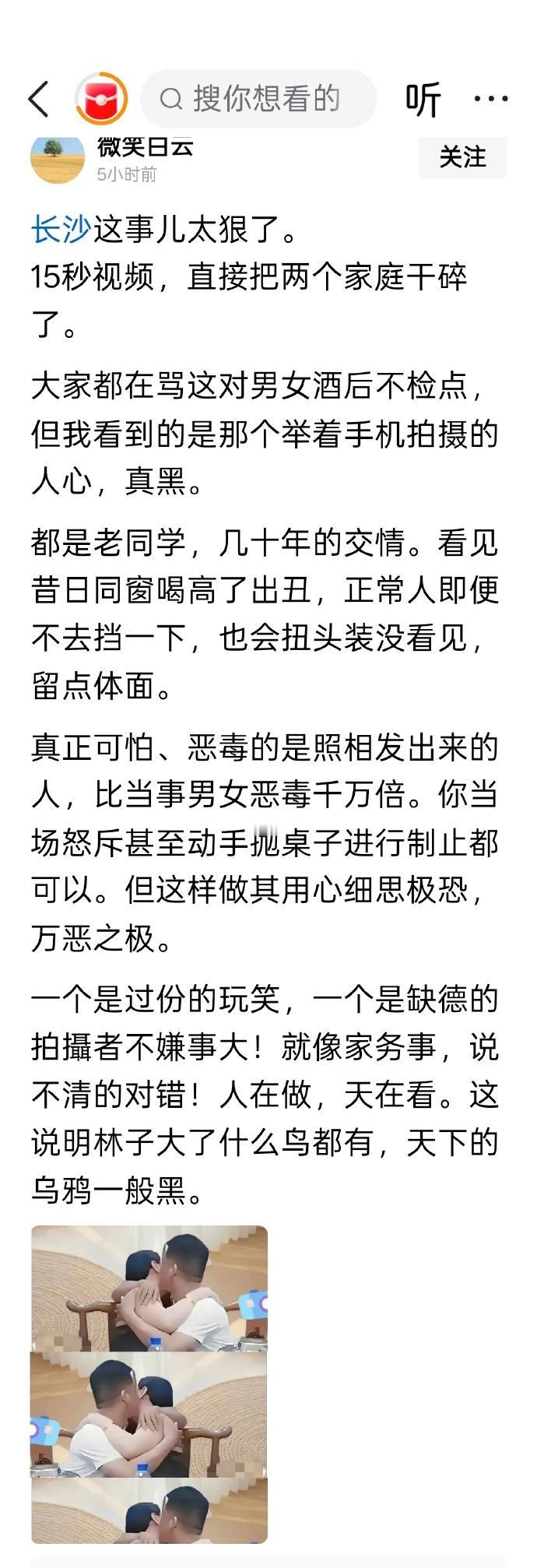 一段15秒的视频,毁了两个家庭。 长沙一场同学聚会,成了“事故现场”。一位女同学酒后情绪上头,抱住当年的初恋男同学就亲。 其实抱抱倒没什么,怀念一下自己的青春。索吻就过分了,越界了。 旁边其他老同学都看傻了,赶紧上前拉开——可偏偏有人掏出手机,全程录了下来。 聚会结束后,这段视频被传到了网上。短短一夜,男女双方的身份、家庭、工作全被扒了出来。女方工作丢了,婚姻也保不住,两家人都被推到了风口浪尖。 有人说“同学会,拆散一对是一对”,没想到竟成了真。在场那么多人,非但没人拦着拍视频,还转头就发上网。自己看看也就算了,这下可好,全网围观。