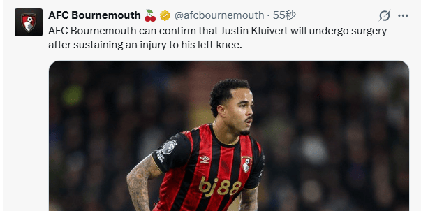 虎扑01月06日讯伯恩茅斯官方宣布,贾斯汀-克鲁伊维特在周末英超联赛对阵阿森纳的比赛后左膝受伤,将接受手术治疗。