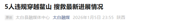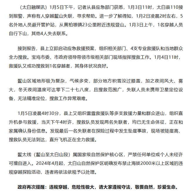 1月6日上午,据“太白融媒”微信公众号,5人违规穿越鳌山,搜救最新进展情况公布: