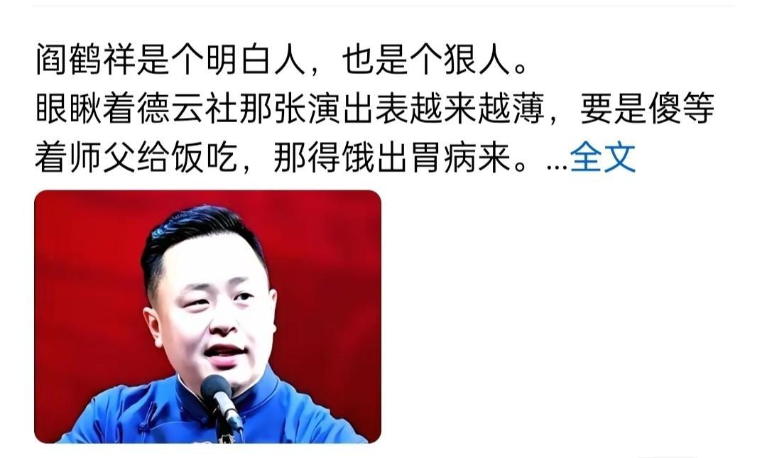 别被“替人鸣不平”的话术误导啦,这看似为张鹤伦、阎鹤祥着想,实则可能是在“逼”他们离开德云社,而离开平台,他们很难维持现有成就。 张鹤伦若单飞,风险极大。网友觉得他专场多,抽成高,可没德云社,他或许还是烧烤摊主。他直播算过账,单飞一场可能净亏65万,而留在德云社,虽有抽成,但年收入稳定,还能开体育馆专场,享受平台带来的各种资源。阎鹤祥亦是如此,他的诸多资源都源于德云社和郭麒麟,《庆余年》旁白等机会皆因于此,若离开,可能又回去当程序员,哪还有这些跨界机遇。 所以,他们的成功是个人努力与平台加持的结果。离开德云社,会失去核心支撑,商业价值将大幅下滑。与其替他们操心,不如尊重他们留在德云社的选择,那才是更明智之举。