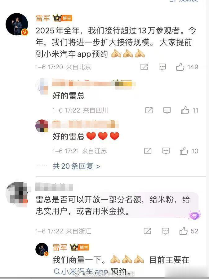 此外,有网友在评论区建议雷军开放部分小米汽车工厂参观名额,给小米的忠实用户等,雷军回应该网友,表示会商量一下。@白鹿视频