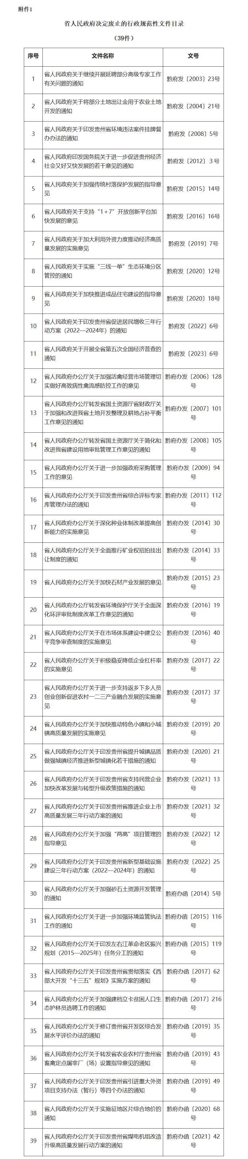 一、对与现行法律、法规、规章、国家政策相抵触,主要内容已被新的法律、法规、规章或者行政规范性文件覆盖,作为主要制定依据的法律、法规、规章、国家政策已经废止,主要内容不能适应经济社会发展需要的39件行政规范性文件予以废止。