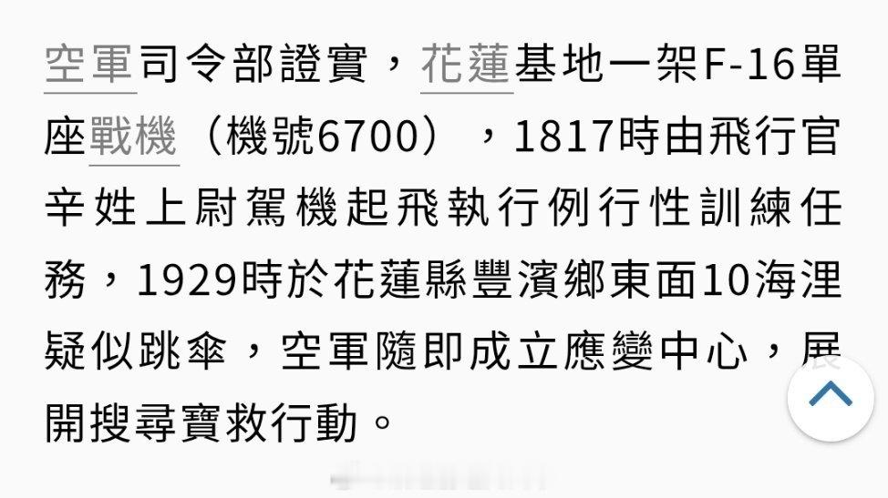 台海局势 台伪空军今晚7点29分掉海里的这个单座F-16目前还没有搜救成功的消息