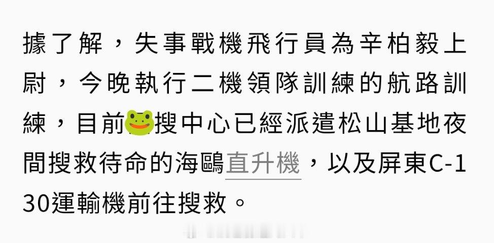 台海局势 台伪空军今晚7点29分掉海里的这个单座F-16目前还没有搜救成功的消息。今天的水温和气温都比较低,飛官辛柏毅上尉还能获救吗?烽火问鼎计划为台独卖命以武拒统只有死路一条