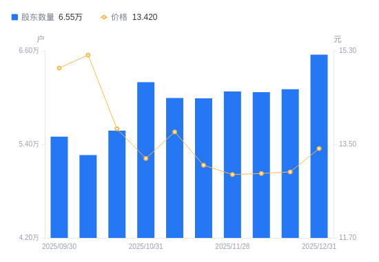 日期A股户数(户)流通A股户均持股数(股)户均持股市值(万元)2025-12-316551418200.0224.422025-12-196107519522.8225.322025-12-106071519638.5725.412025-11-286080519609.5125.342025-11-205991119058.4324.972025-11-105995017299.6023.772025-10-316199116730.0222.132025-10-205575916329.5922.532025-10-105262617301.7426.332025-09-305498816558.5524.79