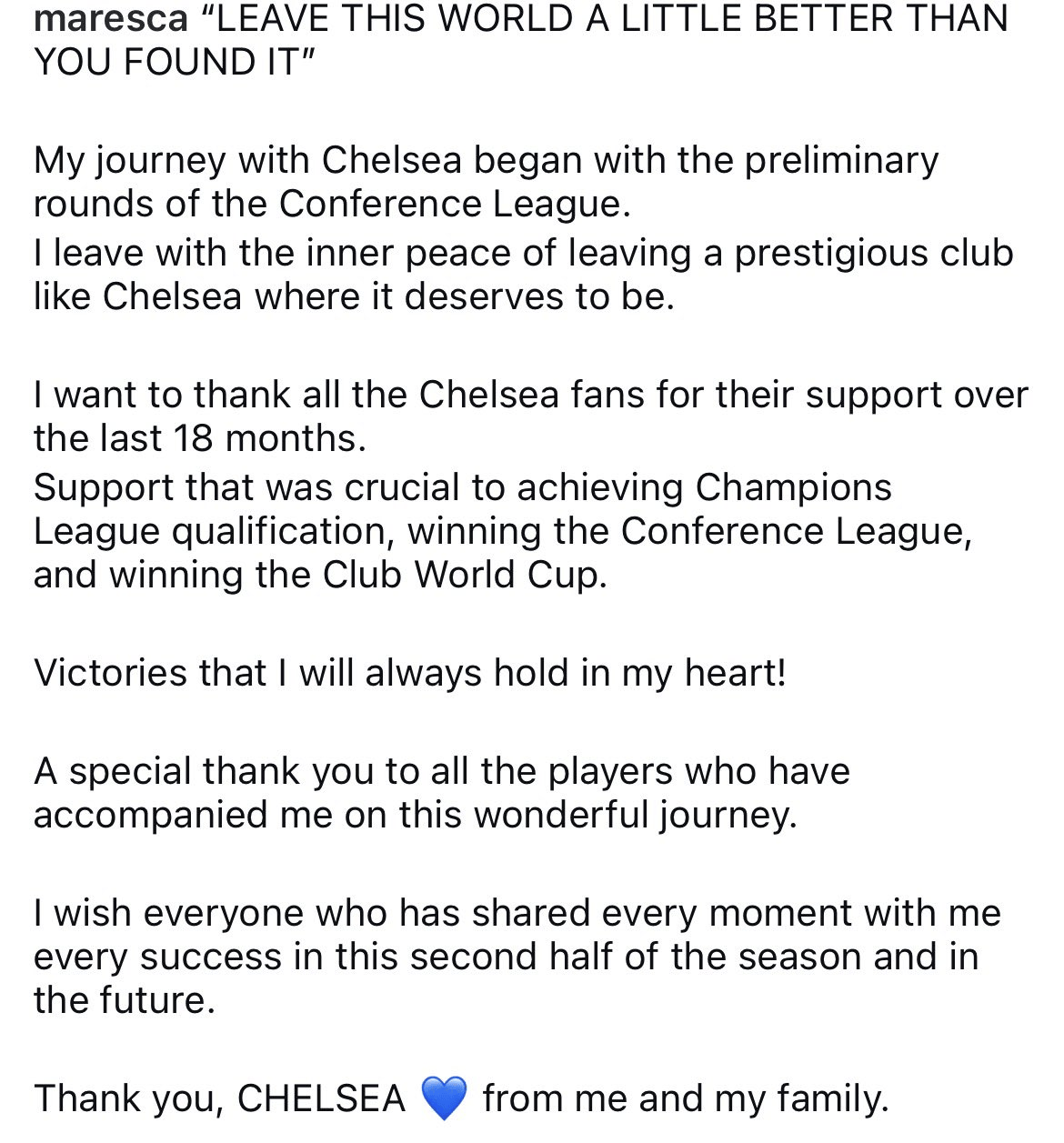 衷心感谢所有切尔西球迷在过去18个月里给予我的支持。正是这份支持,对我们成功取得欧冠资格、赢得欧协联冠军以及捧起世俱杯至关重要。