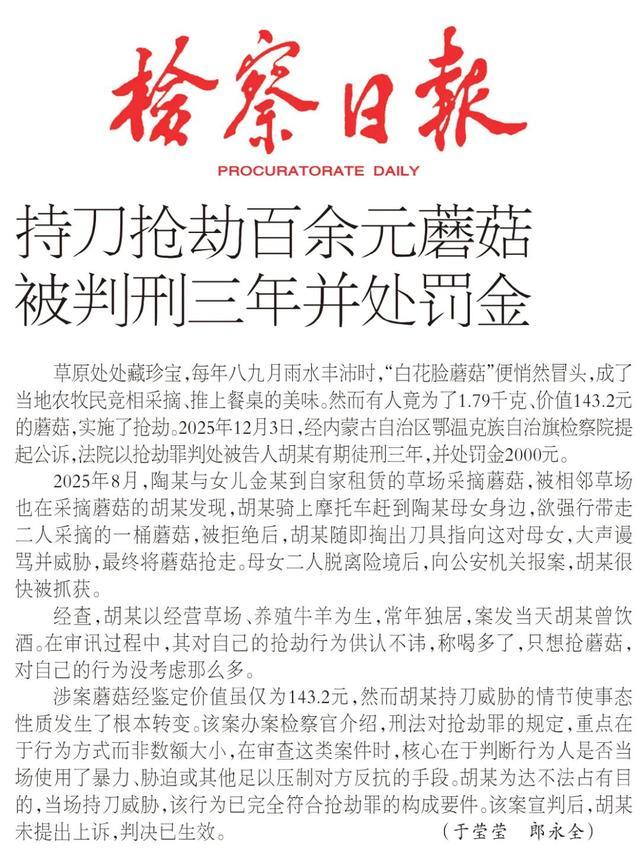 草原处处藏珍宝,每年八九月雨水丰沛时,“白花脸蘑菇”便悄然冒头,成了当地农牧民竞相采摘、推上餐桌的美味。然而有人竟为了1.79千克、价值143.2元的蘑菇,实施了抢劫。2025年12月3日,经内蒙古自治区鄂温克族自治旗检察院提起公诉,法院以抢劫罪判处被告人胡某有期徒刑三年,并处罚金2000元。