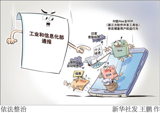 记者1月6日从工业和信息化部获悉,依据相关法律法规,工业和信息化部持续整治App侵害用户权益的违规行为。近期,经组织第三方检测机构进行抽查,共发现22款App及SDK(第三方软件开发工具包)存在侵害用户权益行为。