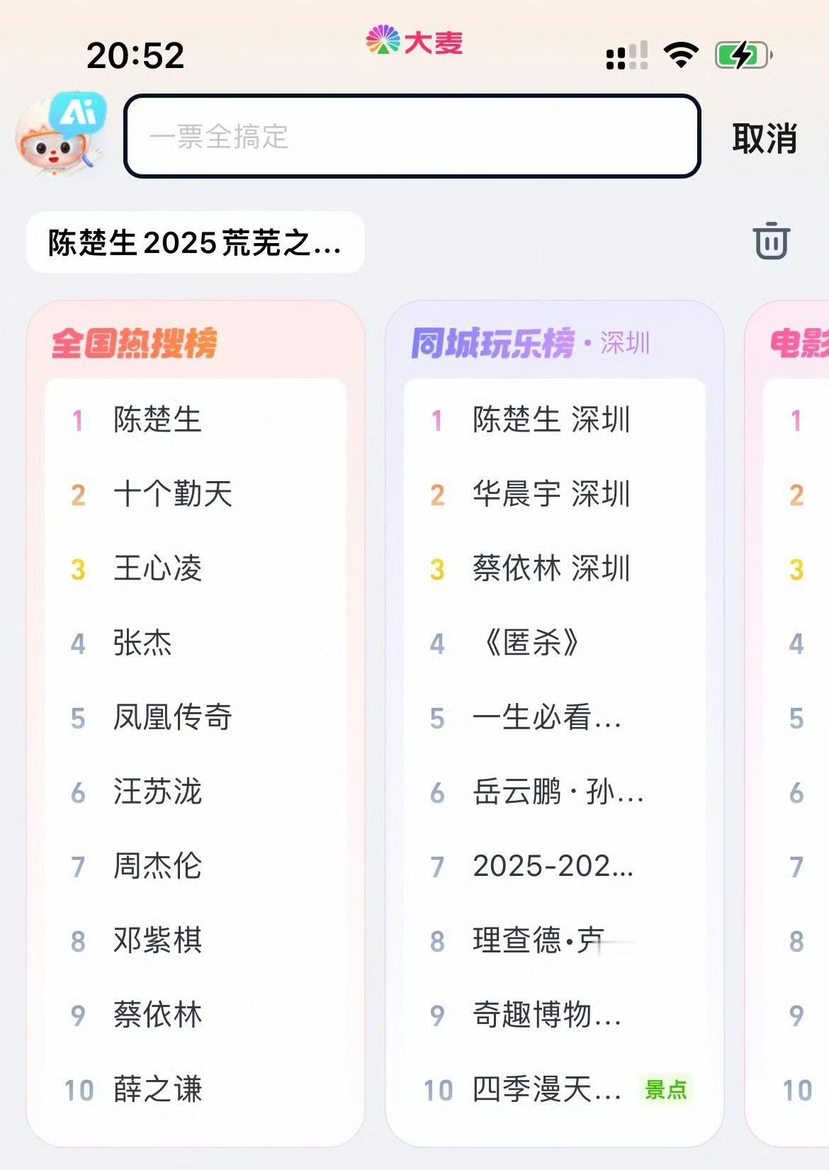 陈楚生大麦全国和同城双榜热搜第一☝️。 这就是咱生哥的实力。 《荒芜之境》深圳场想看人数已达27.2万! 演唱会门票二开后又是秒无! 太期待🥰收官之战了。
