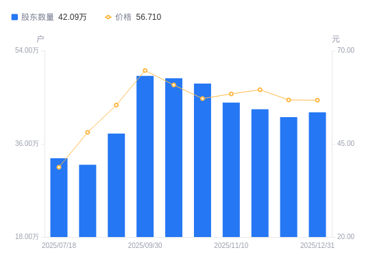 日期A股户数(户)流通A股户均持股数(股)户均持股市值(万元)2025-12-3142092317269.4697.942025-12-1941147817657.39100.262025-12-1042674517025.68101.352025-11-1043975816521.8796.492025-10-2047636115251.7387.162025-10-1048684414923.3290.732025-09-3049145414783.3495.632025-09-2037973419063.01105.632025-09-1031975422638.88108.872025-07-1833232721782.3884.36
