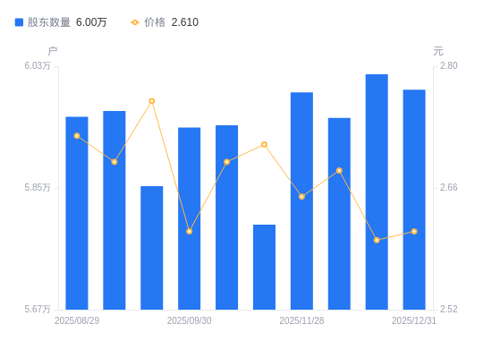 近一年(2024年12月31日至2025年12月31日),中国铁物A股股东户数从6.09万户,减低至6万户,降幅1.52%,区间股价下跌2.36%。