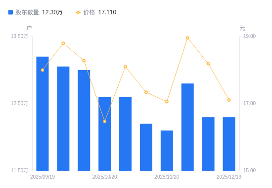 日期A股户数(户)流通A股户均持股数(股)户均持股市值(万元)2025-12-311290007574.4814.332025-12-191230007943.9613.592025-12-101230007943.9614.452025-11-281280007617.7914.442025-11-201210008058.4813.752025-11-101220007992.4313.862025-10-311260007738.7014.012025-10-201260007713.5812.702025-10-101300007476.2413.672025-09-301305257446.1714.00