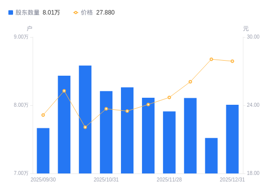 近一年(2024年12月31日至2025年12月31日),锡业股份A股股东户数从8.81万户,减低至8.01万户,降幅9.11%,区间股价上涨94.83%。