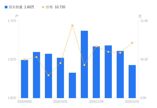 日期A股户数(户)流通A股户均持股数(股)户均持股市值(万元)2025-12-311602719559.3620.972025-12-191646719036.7319.822025-12-101663818841.0719.672025-11-281660918873.9720.032025-11-201709618336.3218.392025-11-101579019852.9322.352025-10-311625519285.0119.462025-10-201637819140.1718.592025-10-101643419074.9519.612025-09-301618619367.2219.75
