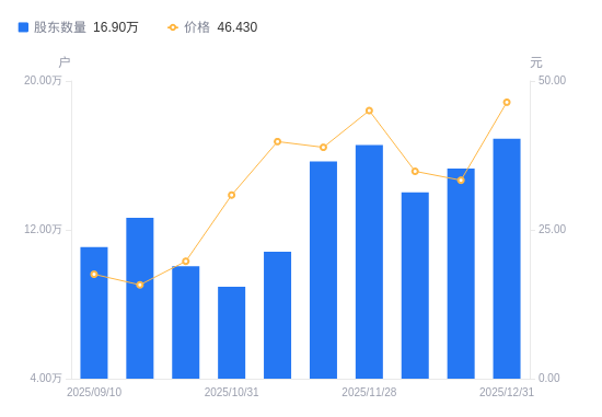 日期A股户数(户)流通A股户均持股数(股)户均持股市值(万元)2025-12-311690232963.7513.762025-12-191528803276.7010.922025-12-101401823573.5112.452025-11-281655373026.1613.632025-11-201567983194.8212.422025-11-101081994629.8218.442025-10-31893605605.8917.292025-09-301004214988.429.842025-09-191264033963.066.252025-09-101107964521.307.93