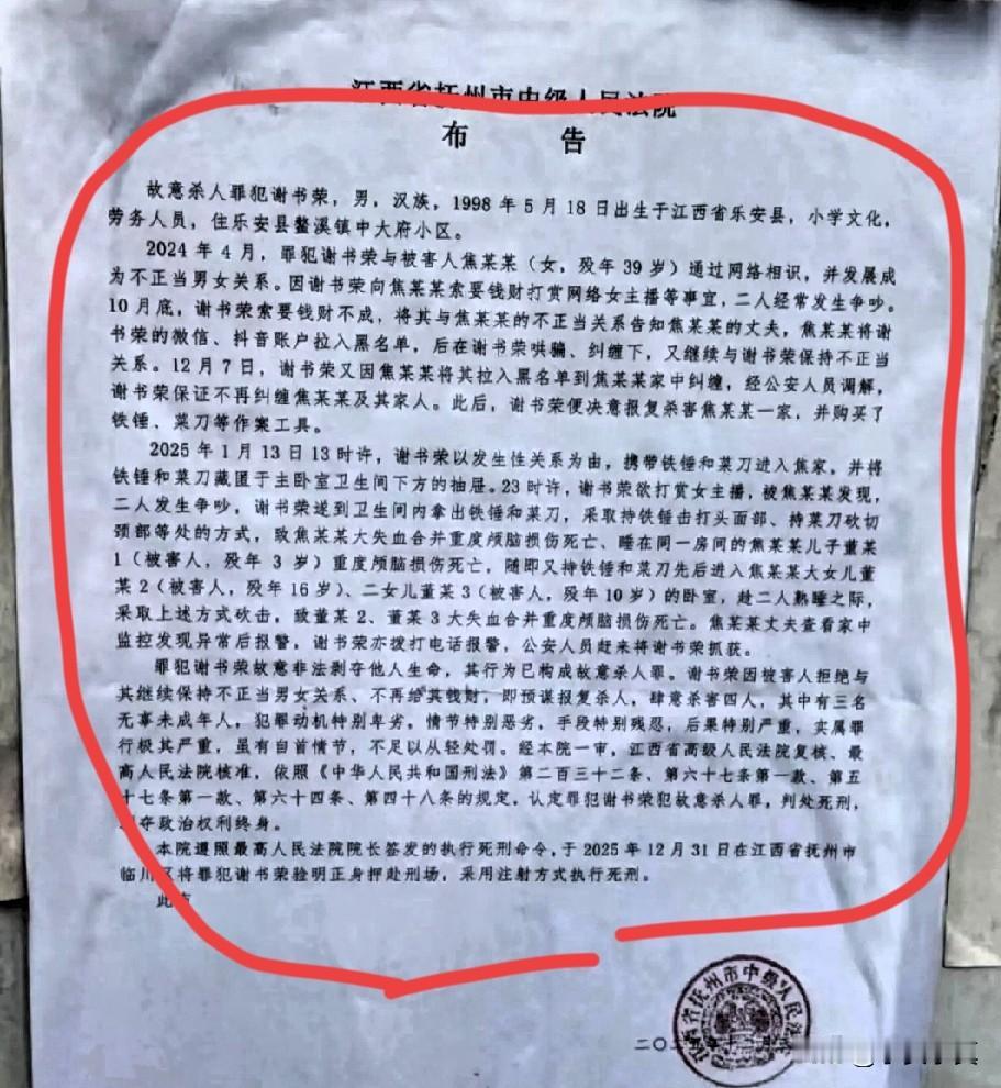 三个孩子成了妈妈出轨的牺牲品, 今日,江西抚州4口命案凶手27岁男子谢书荣,今日执行了死刑。 起因是凶手自己没钱,用情人的钱打赏美女主播。被情人发现后,用事先准备好凶器,杀死情人跟她的两女一男三个未成年人的孩子, 39岁的焦某某凶手没有媳妇光棍一人,情人焦某是有家庭有丈夫和三个孩子妈妈,两个人聊了几天,他们就见面了,并且发展成为了情人关系。