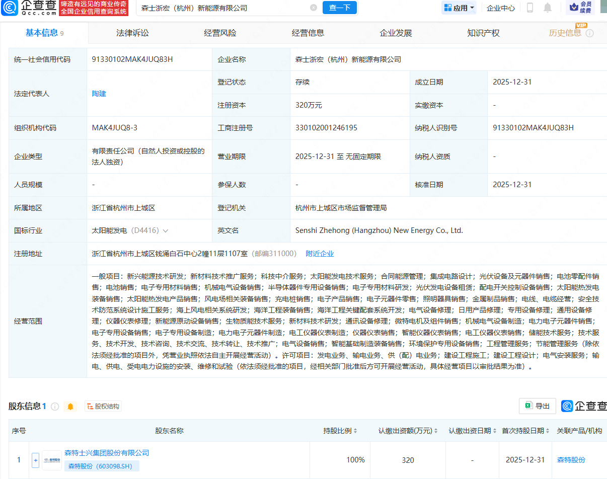 企查查APP显示,近日,森士浙宏(杭州)新能源有限公司成立,法定代表人为陶建,经营范围包含:集成电路设计;电池零配件销售;电池销售;半导体器件专用设备销售;电子专用材料研发等。企查查股权穿透显示,该公司由森特股份(603098)全资持股。