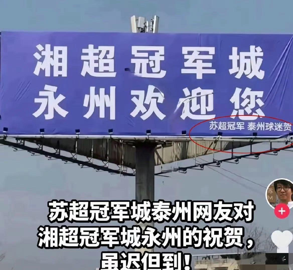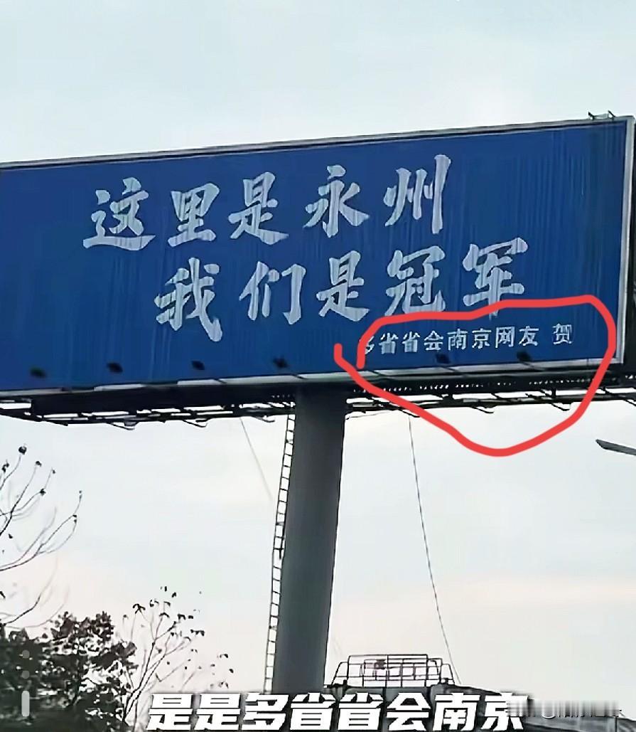 十三太保在永州“斗起来了”[捂脸] 太会玩梗了,被十三太保逗乐了,真是谁也不服谁呀,这次跑到永州“打起来了”,果然有钱就是豪横呀! 苏超虽然结束了,但是十三太保“老大”之争仍在继续呀![捂脸] 起因是湘超永州队夺冠时,一位豪爽的苏州网友在永州市宋家洲大桥旁一块显眼的广告牌上为永州献上祝福,引得永州人的点赞并感谢苏州人的大气。 南京网友发现后酸的不行,紧随其后,在苏州那块祝福广告牌旁也放上了一块同规格的广告牌,落款写上了“多省省会南京网友贺”这落款太绝了,逗乐全网球迷,这难道就是胜负欲吗?[捂脸] 紧接着无锡、南通、扬州、徐州……网友们纷纷加入这场关于存在感的争夺战,把散装江苏的不服输的精神跨地域传递!永州队必赢 永州夺冠 江苏十三太保 苏超十三太保