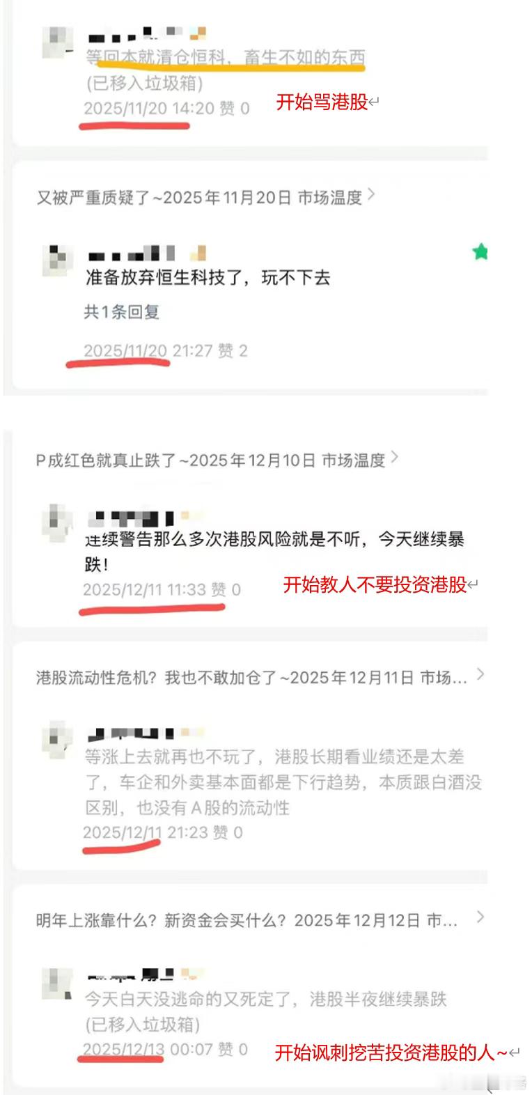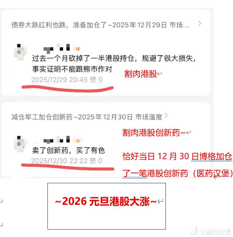 105 条留言暴露了的致命弱点:看看是不是你自己?今天给大家分享一个非常有代表性的【后台评论留言实录】——这位朋友似乎没有关注我,却在后台累计留言了105次。(头像和昵称已做打码处理)下面截取的是他在:2025年4月7日(市场大跌日)到12月30日(年末收官)期间的部分留言记录。之所以想把这些分享出来,是想和大家聊两个投资里最容易被忽视,但却最关键的几个问题:第一,投资里从来没有“早知道”,市场永远是未知的。所以大家买入任何一个标的前,一定要有自己明确的核心逻辑——不是跟着市场情绪走,也不是听别人说“能涨”就跟风。观点可以动态调整,但调整的依据必须是投资逻辑的本质变化(比如行业政策、公司基本面变了),而不是被短期涨跌牵着鼻子走。如果暂时没有成熟的独立判断,那也可以找到真正信任的领路人,相信他的投资体系而非一时的涨跌。否则心态很容易在波动中失衡,短期或许能靠运气赚点小钱,但长期必然很难站稳脚跟,更别说赚到大钱。第二,投资前一定要先认清自己的风险承受能力——比如你能接受的最大亏损比例是多少?能扛住多久的市场回调?想清楚这些,再去匹配对应的投资品种。别只羡慕别人赚钱时的风光,却忽略了他们承受亏损时的煎熬;更别抱着“我肯定不会遇到极端情况”的侥幸,真当亏损落到自己身上时,往往会因为超出承受范围而做出追涨杀跌的错误决策。市场永远有机会,也永远有风险。当认知和耐心匹配时,时间自然会给你应有的回报,这才是投资路上最靠谱的“确定性”。港股基金a股