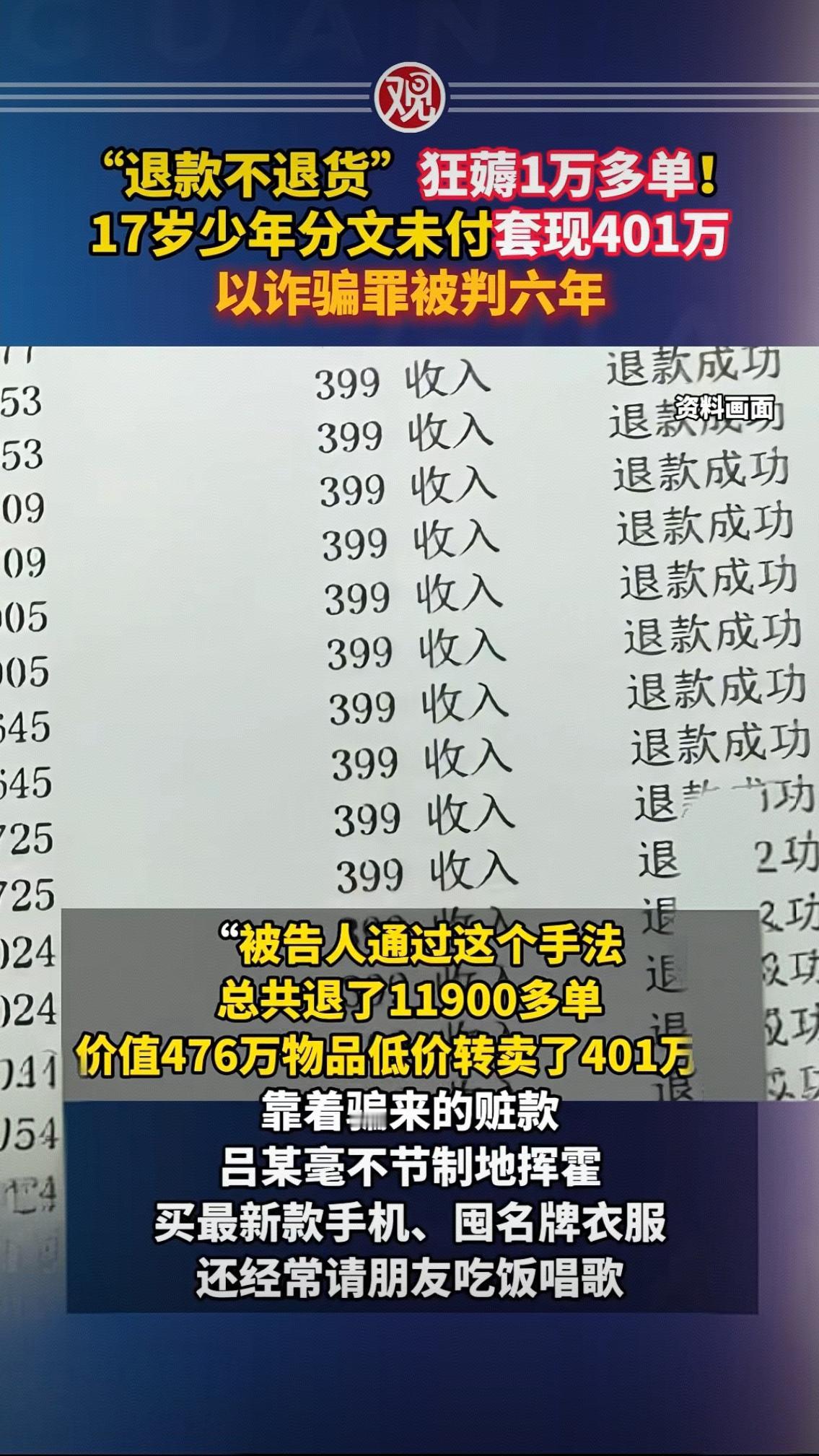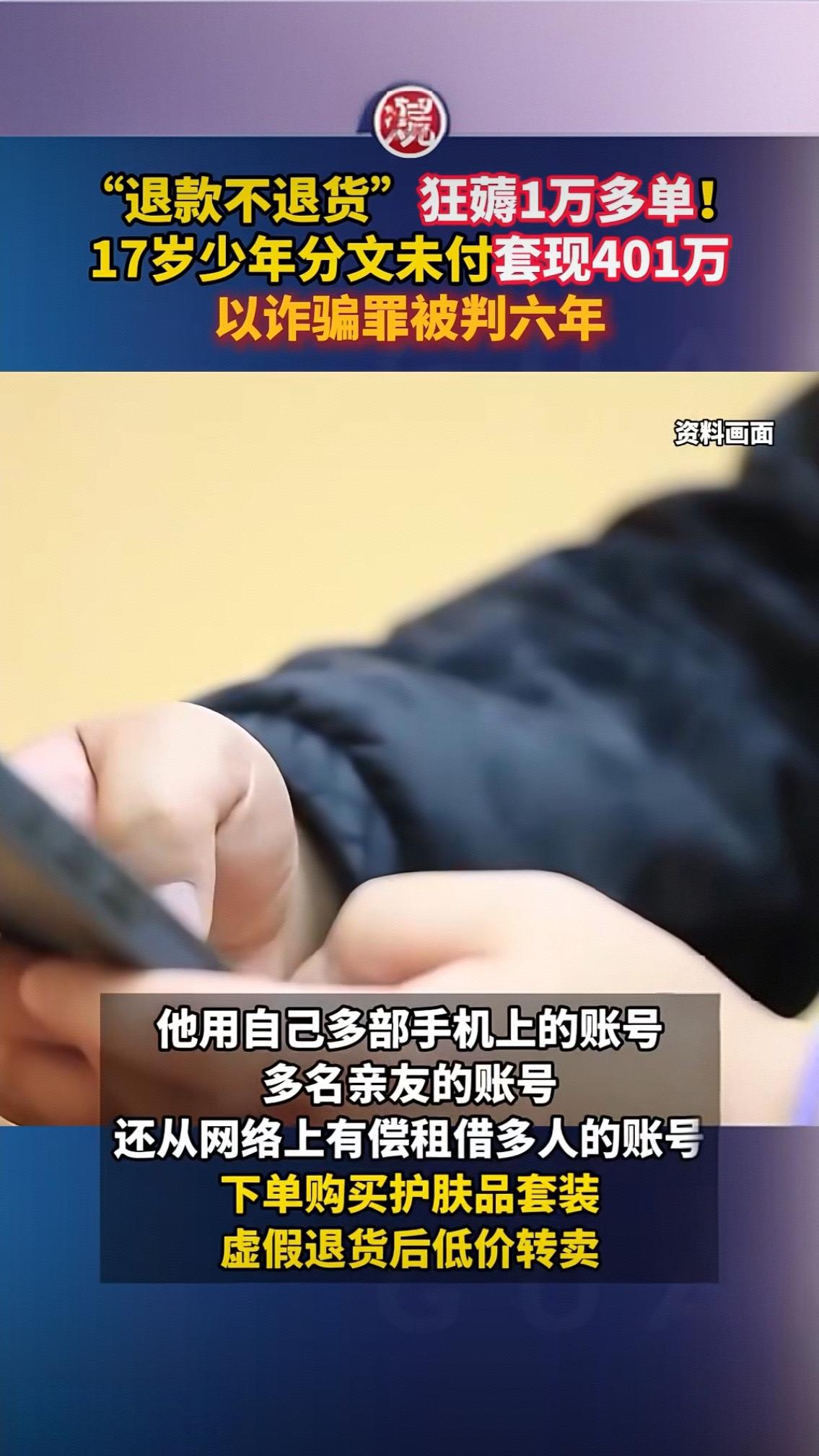 退款不退货狂薅1万单!17岁少年套现401万获刑6年,背后真相扎心了 “退款不退货”狂刷11900多单,分文未付就套走401万,用赃款疯狂挥霍买名牌、泡夜店——这不是某部犯罪电影的剧情,而是17岁少年吕某的真实经历。据央视新闻1月5日报道,这起震惊全网的电商诈骗案,最终以吕某获刑六年落下帷幕,但留给我们的反思远未停止。 时间回到2024年3月,上海一家化妆品经销公司的报警电话打破了平静。公司线上平台突然遭遇大规模恶意虚假退货,大量订单显示“已退款”,但商家始终没收到退回的商品,损失高达476万元。警方迅速介入侦查,顺着海量交易数据和物流信息追踪,最终将目标锁定在年仅17岁的吕某身上。 谁也没想到,这场惊天骗局的开端,竟源于一次偶然的“发现”。吕某在一次网购时意外察觉,该化妆品平台存在致命漏洞:即便不退还商品,只要提交虚假物流单号,就能成功申请退款。侥幸心理像野草般疯长,他很快意识到,这竟是一条“零成本赚快钱”的捷径。从最初的试探性操作,到后来的规模化作案,吕某动用自己、亲友的账号,甚至从网上有偿租借他人账号,三个月内疯狂下单退货,将1万多套护肤品低价转卖,净赚401万。 靠着这笔“不义之财”,吕某彻底迷失在物欲横流的世界里。他抛弃了本该属于少年的校园生活,转而沉迷于挥金如土的日子:最新款手机换了一部又一部,名牌衣服塞满衣柜,频繁请朋友吃饭唱歌,在灯红酒绿中享受着虚假的“成功”。可他不知道,每一笔挥霍的赃款,都在为自己的人生埋下定时炸弹。 案发后,面对检察官的讯问,吕某或许才真正意识到问题的严重性。尽管他作案时未满18周岁,且认罪认罚、退缴部分赃款获得从轻处罚,但诈骗金额已远超“数额特别巨大”标准,最终被上海市浦东新区人民法院以诈骗罪判处有期徒刑六年。这六年刑期,将成为他人生中最沉重的教训,也击碎了一个家庭的希望。 更值得警惕的是,吕某的案例并非个例。浙江台州的程某利用外卖平台漏洞,两年“零元购”476笔,涉案25万元;上海的方某用空包退货骗取5706个枕头,获利114万后获刑十年。这些案件背后,都藏着同样的贪婪与侥幸。他们误以为“薅平台羊毛”是小聪明,却不知“七天无理由退货”是买卖双方的诚信约定,绝非非法牟利的工具。 17岁,本是价值观成型的关键年纪,吕某却因一时贪念触碰法律红线,令人惋惜更引人深思。是谁让他觉得“赚快钱比守规矩重要”?是谁让他对法律缺乏最基本的敬畏?家庭的监护缺失、学校的法治教育薄弱、网络不良风气的侵蚀,或许都是推手。而平台的风控漏洞,也给了不法分子可乘之机。 这场骗局终以刑罚收场,但留下的拷问从未停止:当“一夜暴富”的幻想诱惑着年轻人,当规则漏洞成为滋生贪婪的土壤,我们该如何守住诚信底线?或许答案就在每个人心中——捷径从来都藏着陷阱,唯有敬畏法律、坚守诚信,才能走得稳、走得远。你怎么看待这起案件?欢迎在评论区留下你的观点。