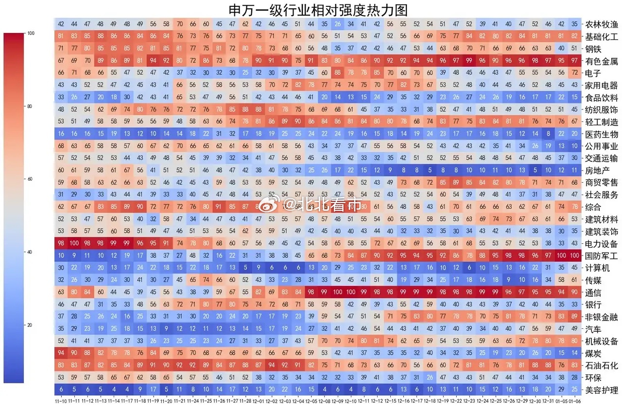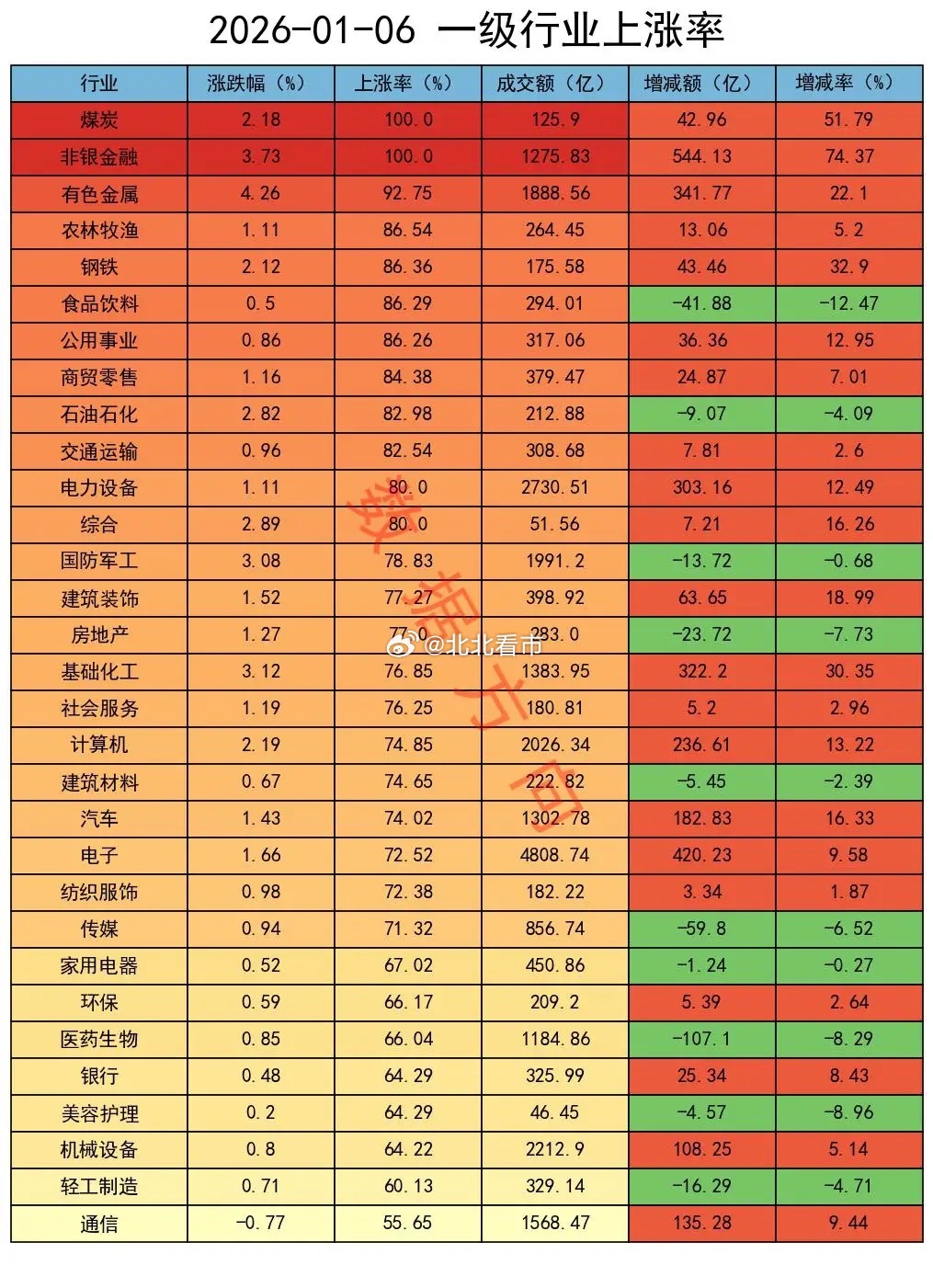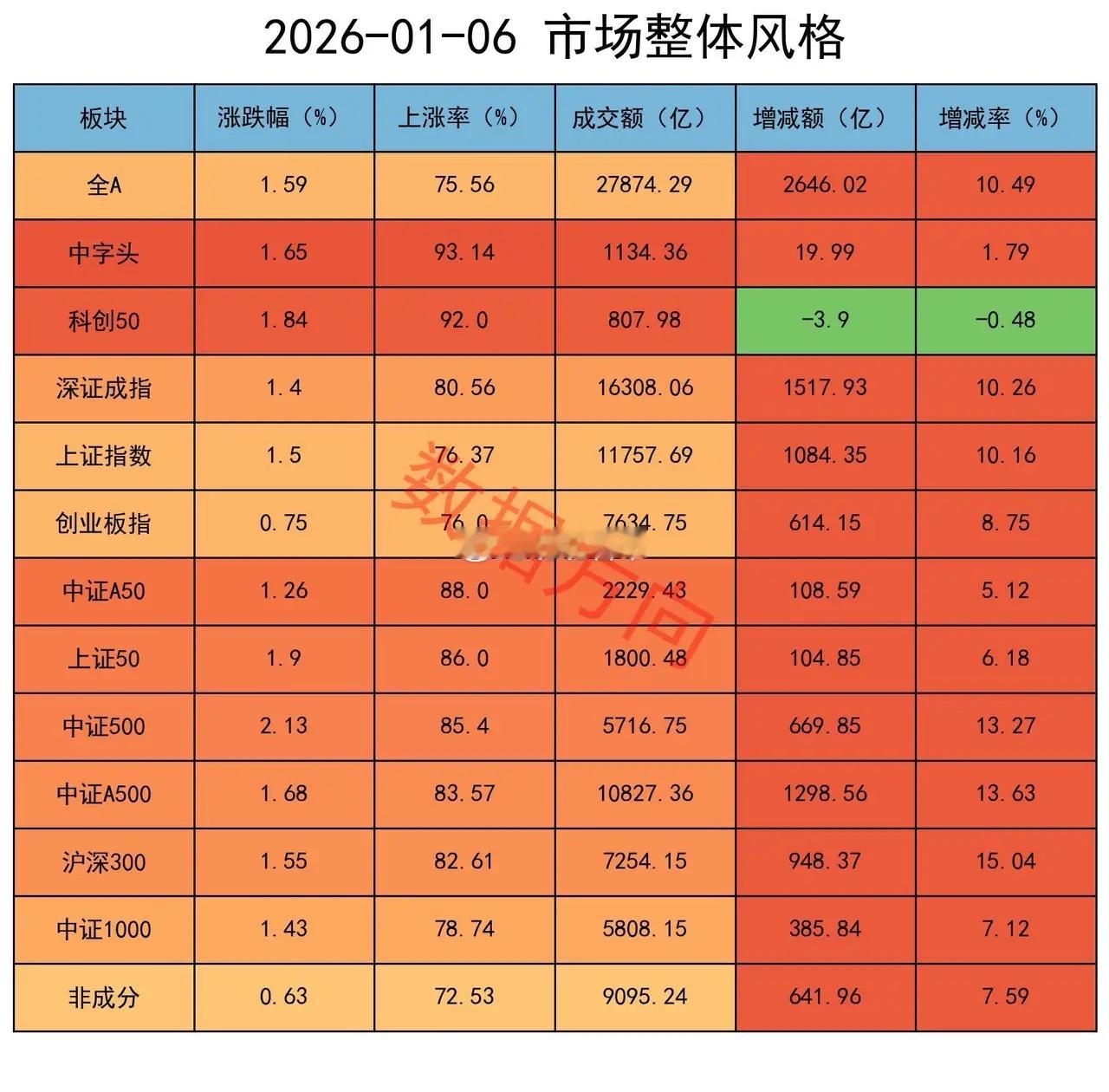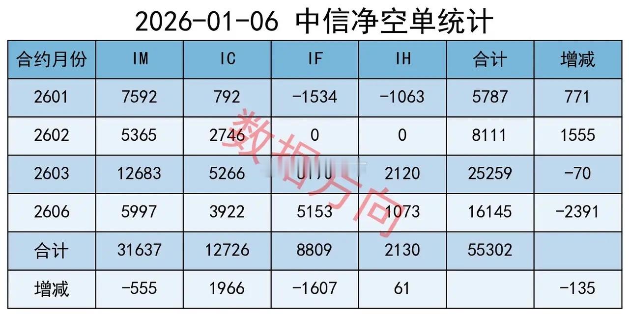 A股强势爆发,打破33年纪录,继续加空大盘延续强势,全A指数涨幅1.59%,保险、商业航天、脑机接口、有色金属等全线大涨,全部31个申万一级行业,除了通信逆市下跌,其它30个行业全飘红,个股上涨率76%,成交额较昨日放大10%。所有宽指全部上涨。上证指数再涨1.5%,这是其连续收出的第13根阳线,一举创出新纪录。其在1992年曾实现12连阳,此纪录保持了33年之久。非成分,涨幅0.63%,在所有宽指中涨幅最小。数据方向认为,本轮行情,至少是一轮指数大牛市,很多小微盘股很可能跟不上节奏,一定要尽早转变意识。盘面强势特征明显,从复盘数据看,机构们继续采取了加空的操作。行业煤炭、有色金属、钢铁、公用事业、石油石化,一起进入榜单前十基础化工,虽然仅位于行业榜单第16名,但行业涨幅高达3.12%大宗商品方向强得一匹!隔夜伦敦LME铜价上涨近2%,创阶段新高。1月6日早盘,伦敦铜价涨幅扩大,日内涨超1.4%,突破每吨13100美元,续创新高,伦敦铝价延续强势。美联储降息预期升温、库存持续下行,以及全球经济修复的预期,是铜价持续新高的逻辑。贵金属期货持续拉升。沪银、铂主力合约日内涨幅超7%。多家黄金珠宝品牌境内足金首饰延续涨势,周大福、周大生等足金首饰报1390元/克。化工方向亦表现活跃。TDI、MDI、PX、硫酸等化工产品价格连续反弹,春节前补库存需求集中释放。万华化学、巴斯夫、陶氏等龙头企业接连发布涨价函,供需两端共振使得行业底部反转信号更明确。非银金融,大涨3.73%,个股上涨率100%,较昨日放量74%一边是保险板块持续强势,一边是券商板块强势归来。2025 年前 11 个月保费收入同比增逾 7%,银保渠道受益于居民 “存款搬家” 延续高增长,个险渠道边际改善。权益市场走强与长端利率企稳,推高险资投资收益,利好利润与净资产表现。A股持续走强,沪指13连阳后创十年新高,两融余额突破2.5亿,将直接带动券商经纪、自营业务收入增长。通信,跌幅0.77%,是今天唯一下跌的板块受益于人工智能的高速发展,算力板块在去年的走势非常惊艳。板块在这个时间出现滞涨,尤其需要引起注意。现在是2026年初,是一个特殊的时间节点,机构们在去年打排名,做季报、年报的工作已经结束,现在进入新的周期,可能有些事情需要做一个了断。热力图此图用于观察市场强度结构。国防军工(100)、有色金属(97)、通信(90),是当前最强的三个行业。通信(90)、电子(72)、传媒(61)、计算机(45),科技方向平均强度为67。国防军工(100)、机械设备(80)、汽车(49)、家用电器(43)、电力设备(43),高端制造方向平均强度为63。有色金属(97)、石油石化(83)、基础化工(82)、钢铁(51)、煤炭(14)、公用事业(10),大宗商品方向平均强度为56。非银金融(89),持续走强,强度逼近90。医药生物(20),脑机接口只是一个小分支,不足以带动整个行业。期指持仓某信,减空135手;分别对IH、IC加空61手、1966手,分别对IF、IM减空1607手、555手;加仓买单2677手,加仓卖单2542手。其他主要玩家,加空3555手;分别对IH、IF、IC加空363手、2552手、758手,对IM减空118手,加仓买单6858手,加仓卖单10413手。大盘延续强势,指数、个股普涨。两者合计加空3420手,以加仓卖单为主,只看今天是比较正常的操作。只不过之前已有12万手净空单,今天操作完成后,此数据来到126377手,已经超过了近期的峰值。2025年8月25日为125022手,大盘从那个时候开始,横盘整理了四个多月的时间。历史峰值为135261手。合计对IH、IF加空1369手,合计对 IC、IM加空2051手。两者因为昨天持有的122957手净空单,会在今天的行情中亏损近30亿(昨天亏损35亿)。不敢轻易看空,个人认为应该注意结构,大宗商品、保险等。