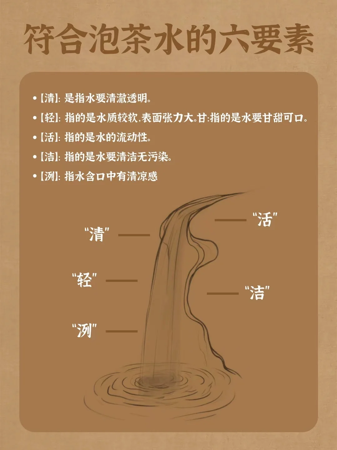 泡茶用水要求软水为佳,硬水为次,对于用水的选择依次为山泉水 > 纯净水 > 净化水 > 自来水。 其次泡茶需符合“清、活、轻、甘、冽”等标准 ,具体为水质要清且干净、水源要鲜活、水体要轻、水味要甘甜、有清冽感。 〰️泡茶用水要求: 1️⃣ 水质要清。 2️⃣ 水体要轻。 3️⃣ 水味要甘。 4️⃣ 水温要冽。 5️⃣ 水源要活。 你平时泡茶都用什么水⁉️分享一下吧~