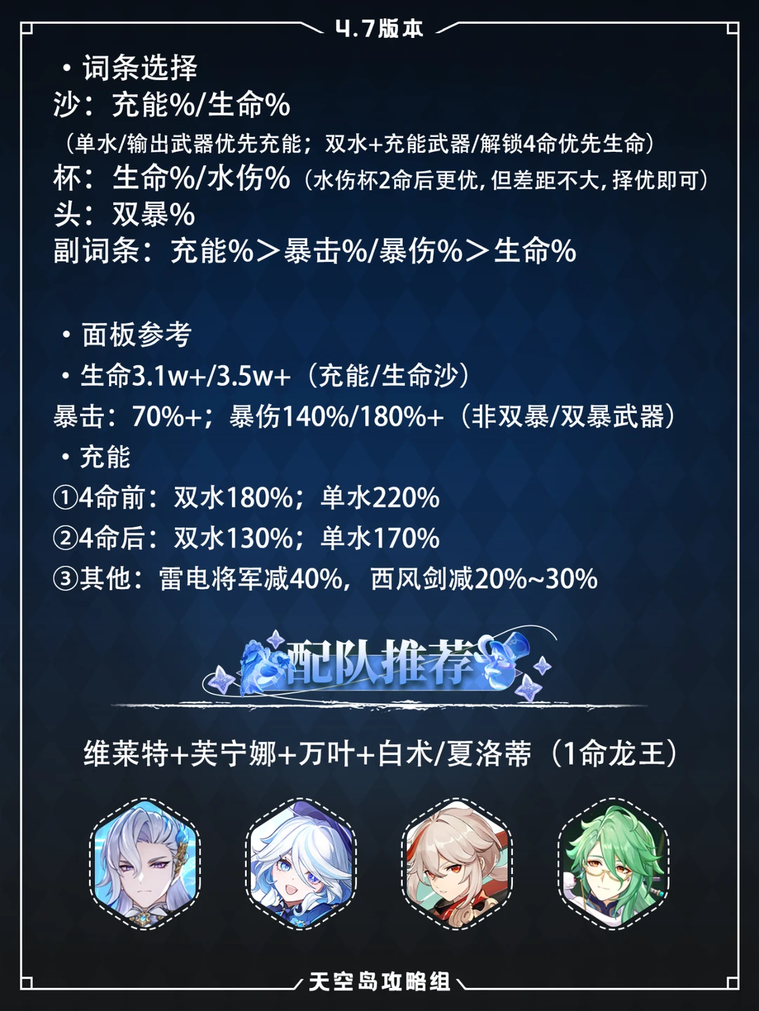 圣遗物优先:充能/生命沙、生命/水伤杯、双暴头