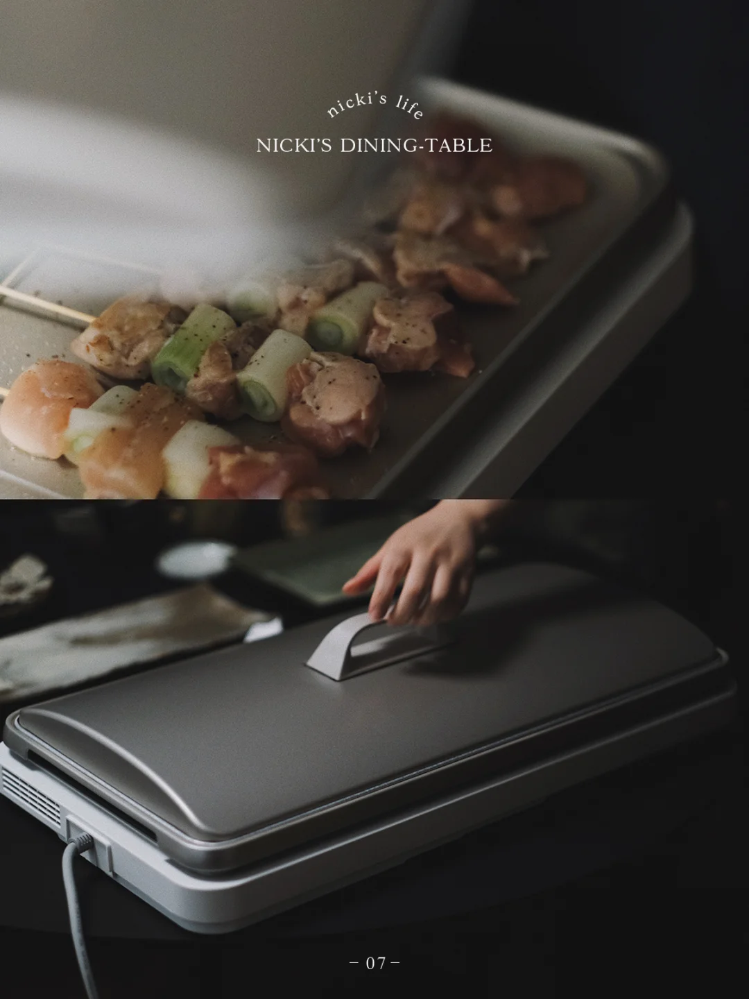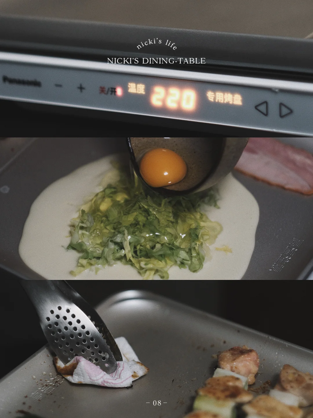 立马用他来做了一顿居酒屋料理,他的烤盘尺寸容量很大,一半用来做鸡肉串,另一半做大阪烧,两边温度可以分开调节,不必担心在制作一边的同时,另一边会顾不上。放上韭菜猪肉锅和红豆圆子汤,可以一边吃着烤串,一边等猪肉锅烧开,红豆圆子汤还可以在另一边持续保温。有了多功能料理机,约上三五好友来家里聚餐,妥妥让大家吃到扶墙出,简直是家中神器!