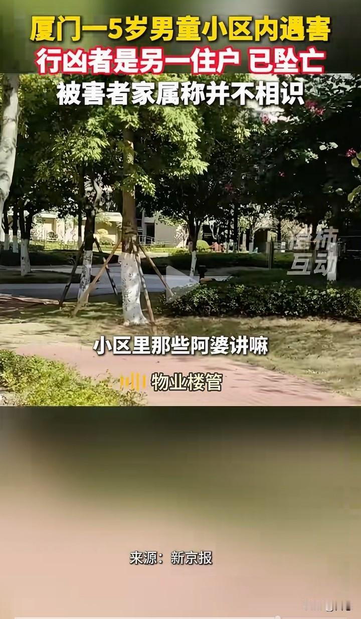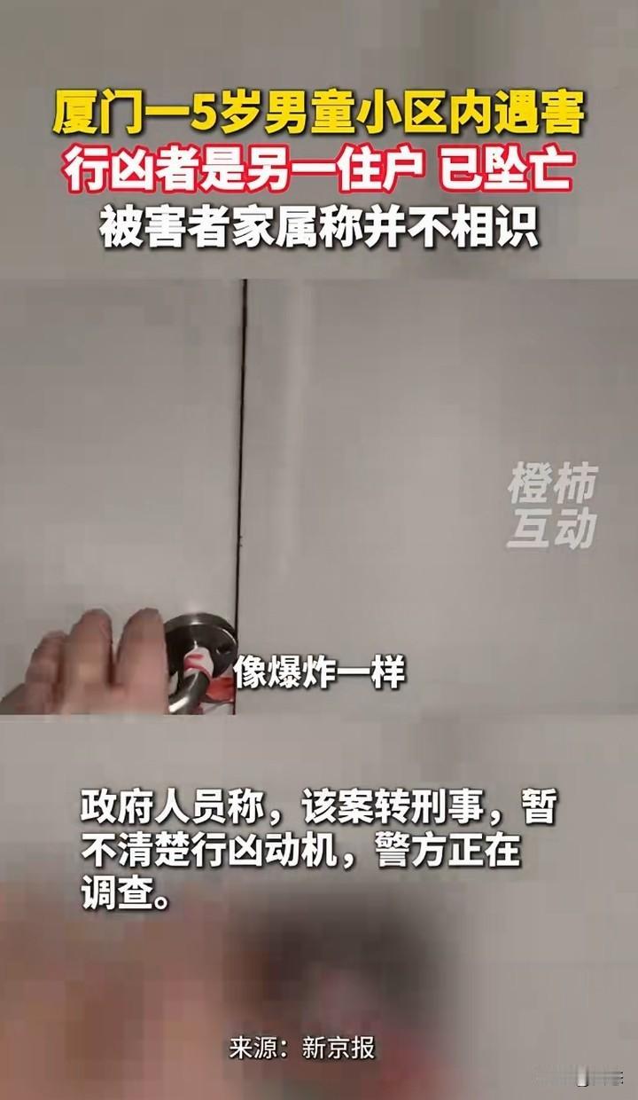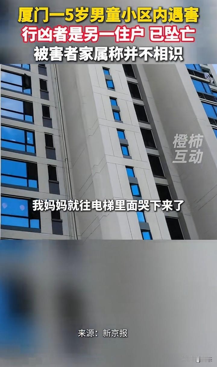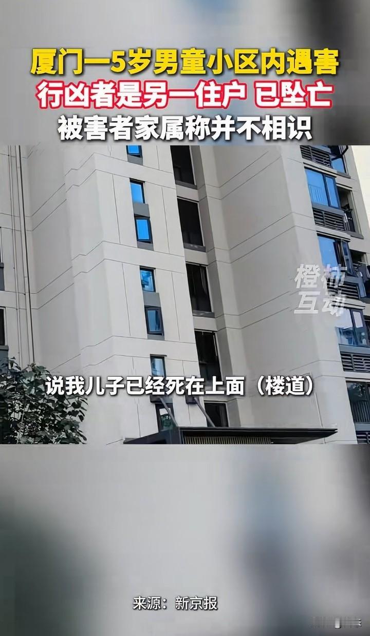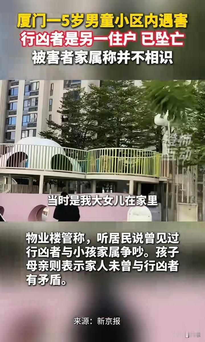 厦门一5男童在小区里面遇害,警方经过调查,犯罪嫌疑人是另一住户,年龄59岁张某,女。张某在作案后当场自杀身亡。而被害人的家属称,和犯罪嫌疑人不认识。 有人称,见到过孩子的家属和嫌疑人有过争吵,可是家属称和行凶者没有矛盾。 一个老人对一个小孩下手,这样的人找什么理由都是徒劳的,就算和家属有矛盾,杀害小孩能解决问题吗?害人害己。 在这里提醒一下,有矛盾可以当面解决,没有什么过不去的坎。 可惜了孩子!这让孩子的家长怎么过啊! 你们怎么看呢?为什么对孩子下手?
