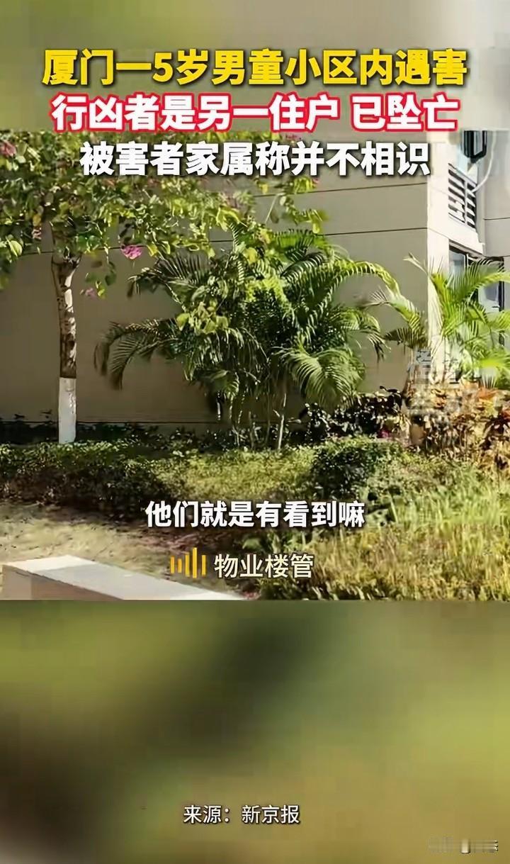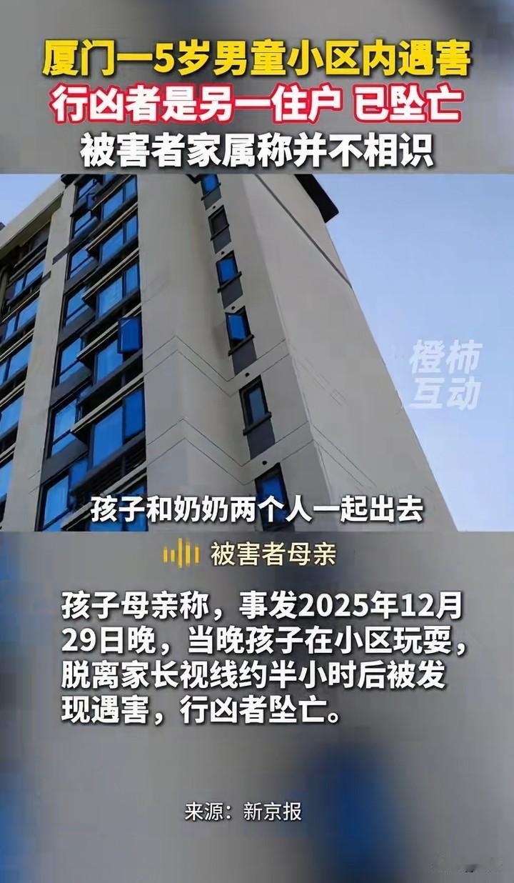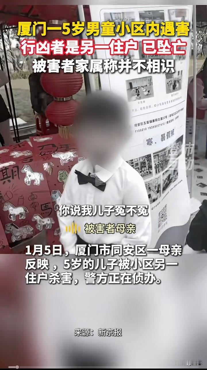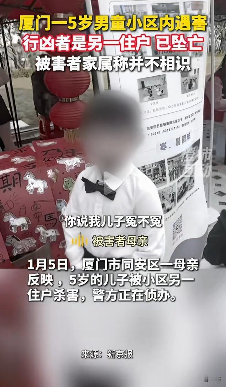 厦门一5男童在小区里面遇害,警方经过调查,犯罪嫌疑人是另一住户,年龄59岁张某,女。张某在作案后当场自杀身亡。而被害人的家属称,和犯罪嫌疑人不认识。 有人称,见到过孩子的家属和嫌疑人有过争吵,可是家属称和行凶者没有矛盾。 一个老人对一个小孩下手,这样的人找什么理由都是徒劳的,就算和家属有矛盾,杀害小孩能解决问题吗?害人害己。 在这里提醒一下,有矛盾可以当面解决,没有什么过不去的坎。 可惜了孩子!这让孩子的家长怎么过啊! 你们怎么看呢?为什么对孩子下手?