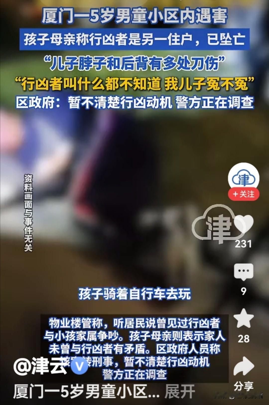 厦门市同安区某小区发生一起凶杀案,一名5岁的男孩被同小区的邻居杀害。 12月29日傍晚,这个5岁的小男孩像往常一样,带着自行车和奶奶一起到楼下玩耍。20时许,小男孩被一名59岁的女子张某持刀杀害,小男孩的脖子和后背有多处刀伤。张某杀害小男孩之后,自己也跳楼自杀了。 张某为什么要杀害小男孩呢?有居民反映可能是张某与小男孩家属有矛盾,物业楼管称,有居民曾听到犯罪嫌疑人张某与小男孩家属争吵过,而小男孩的母亲却否认了这一点,并表示连“行凶者叫什么都不知道”。案件正在侦查之中,相信真实原因很快就会水落石出。 不过我认为,张某的行凶不外乎两个原因:一是患有精神病;二是因为大人之间的矛盾而行凶。 如果是前一个原因,小区物业和张某的监护人就有管理责任。如果是后一个原因,这个张某就太冲动太残忍太没有法律意识啦,不管大人之间有什么矛盾,都不应该动手杀人,更何况还是杀的一个无辜的手无缚鸡之力的小男孩。