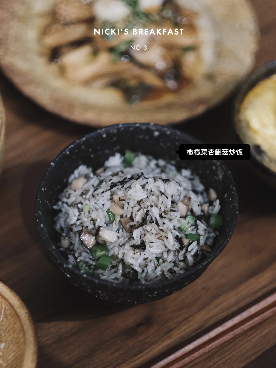 • 锅中倒油,先煸炒杏鲍菇粒,炒软之后倒入米饭,加2勺橄榄菜,1小勺盐,辣椒丁翻炒均匀,尽量把米饭炒干,粒粒分明。