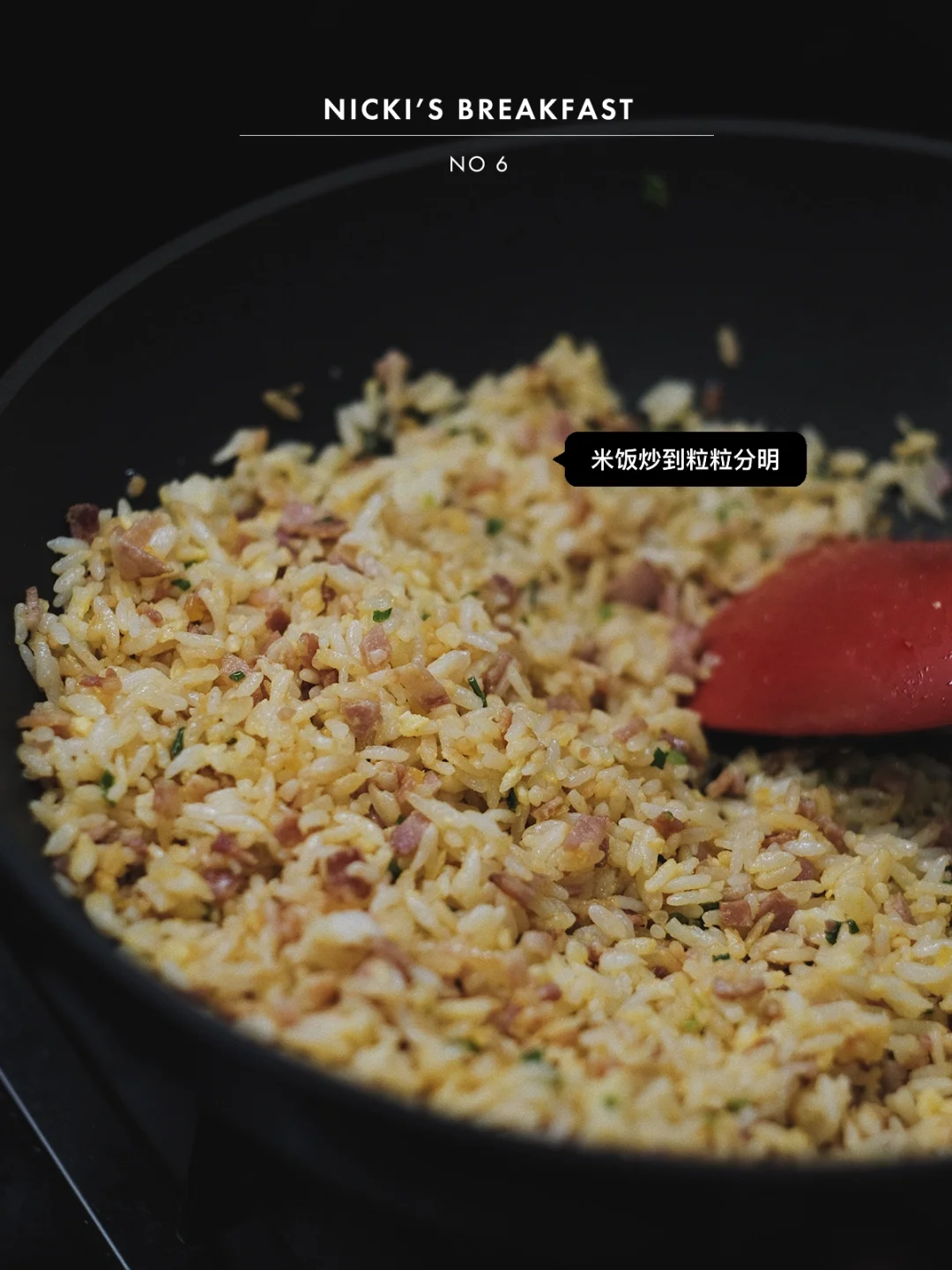 •把米饭炒松后,放入刚刚煎好的培根丁,加少许盐(培根本身有咸味),炒至米饭粒粒分明即可出锅。