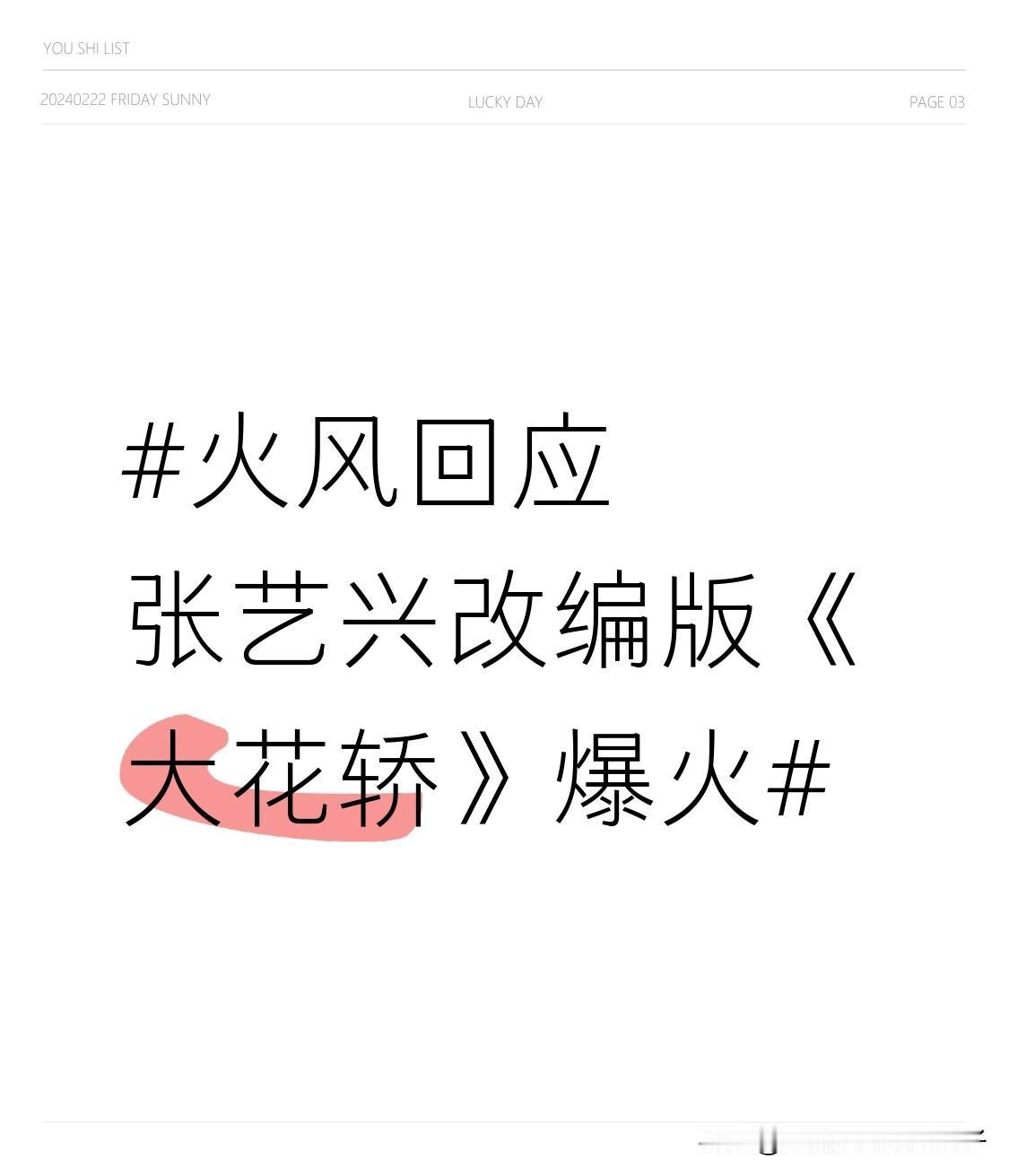 火风回应张艺兴改编版《大花轿》爆火 2025 年 12 月 31 日,张艺兴在跨年晚会上改编演唱的《大花轿》爆火。他把唢呐、电子鼓点等元素融入其中,土潮碰撞,舞蹈还结合了东北秧歌与街舞,“比心+半蹲”和“抱一抱”互动更是全网模仿。 2026 年 1 月 4 日,原唱火风喊话想上“大花轿”,不少网友还开玩笑要排队。张艺兴唱功一直厉害,此前穿睡衣唱《大东北我的家乡》飙高音就惊艳众人。 这次老歌翻新很成功,电音强拍、民族旋律记忆点和舞蹈戏剧性结合,形成高辨识度。张艺兴回应愿合作,要是火风开嗓,艺兴用电子乐和舞蹈推进,民族与现代对拍,那场面肯定超绝!